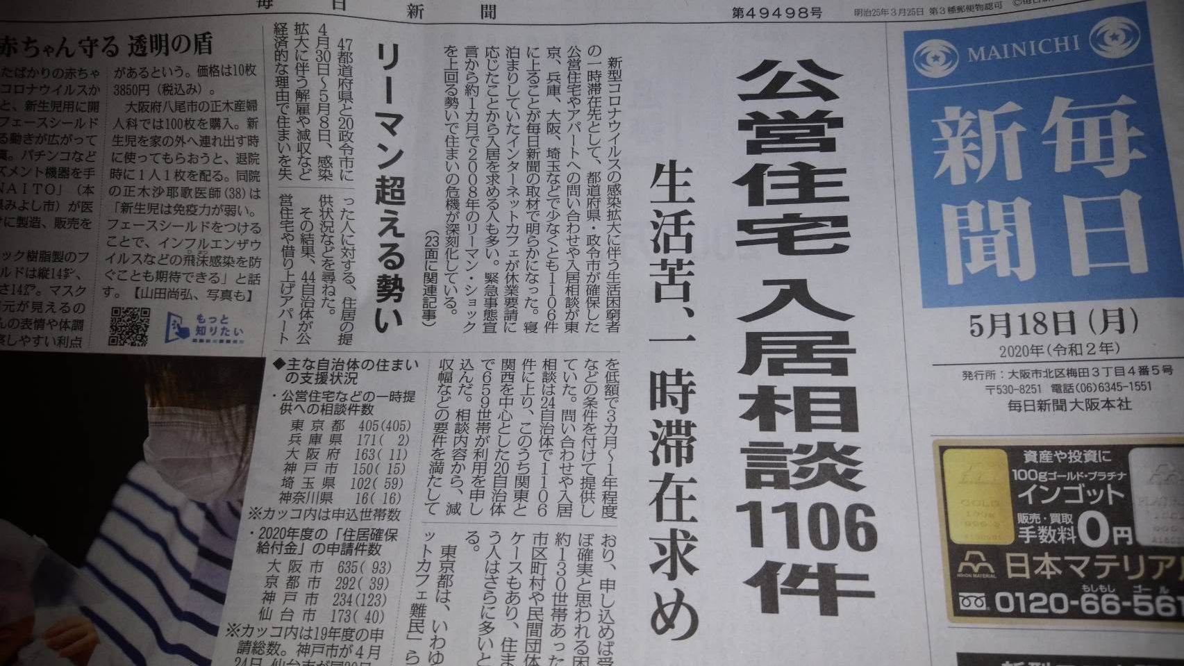 経済的理由で住まいを失った方や家賃が払えなくなった方から、役所への公営住宅の入居相談も、緊急事態宣言後に急増。リーマン・ショックを上回る勢いで、住まいの危機が深刻化していることが、今朝の毎日新聞一面でも報道されていました。