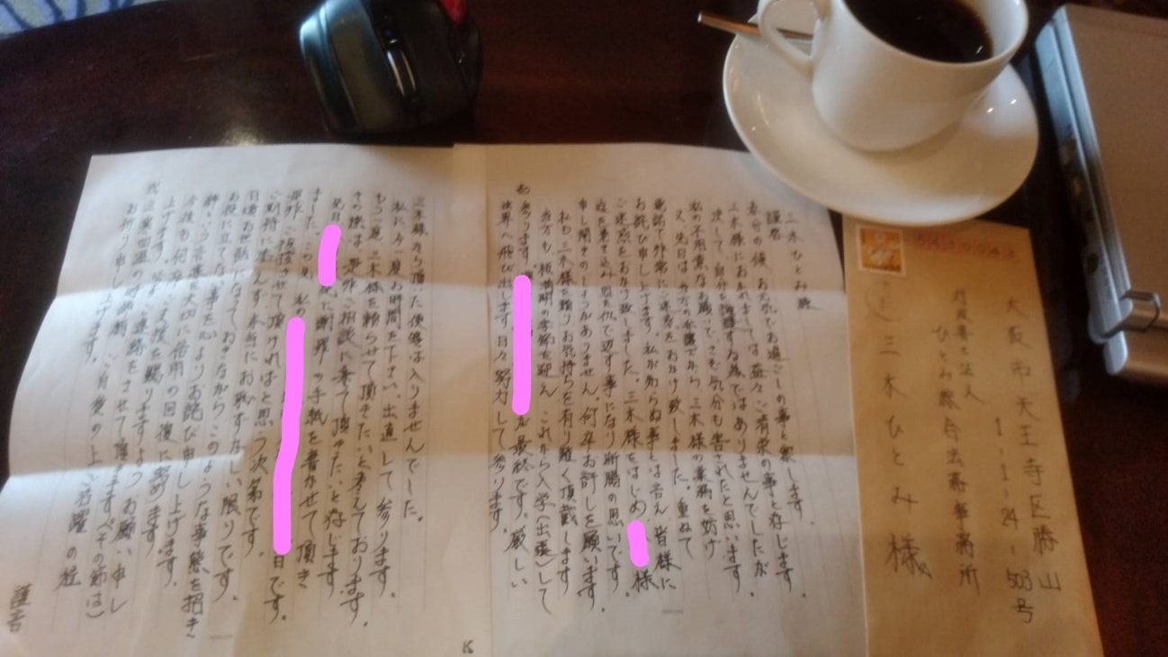 こちらは少し前に頂いた、別のお客様からのお手紙です。この方も職と住まいを同時に失い、行政書士法人ひとみ綜合法務事務所とお付き合いのある家主さんの善意によって初期費用免除で賃貸物件に入居させてもらい、生活保護決定したものの、刑事事件を起こしてしまったのです。しっかりと罪を償って、再び社会に出たときには、行政書士としてまたできるサポートはさせてもらいますと伝えています。家主さんが優しい方で、荷物もすべて出所までそのまま無償で預かってくれています(※逮捕された日から生活保護は打ち切りになったため、役所からの支給は一切ないのです)。
