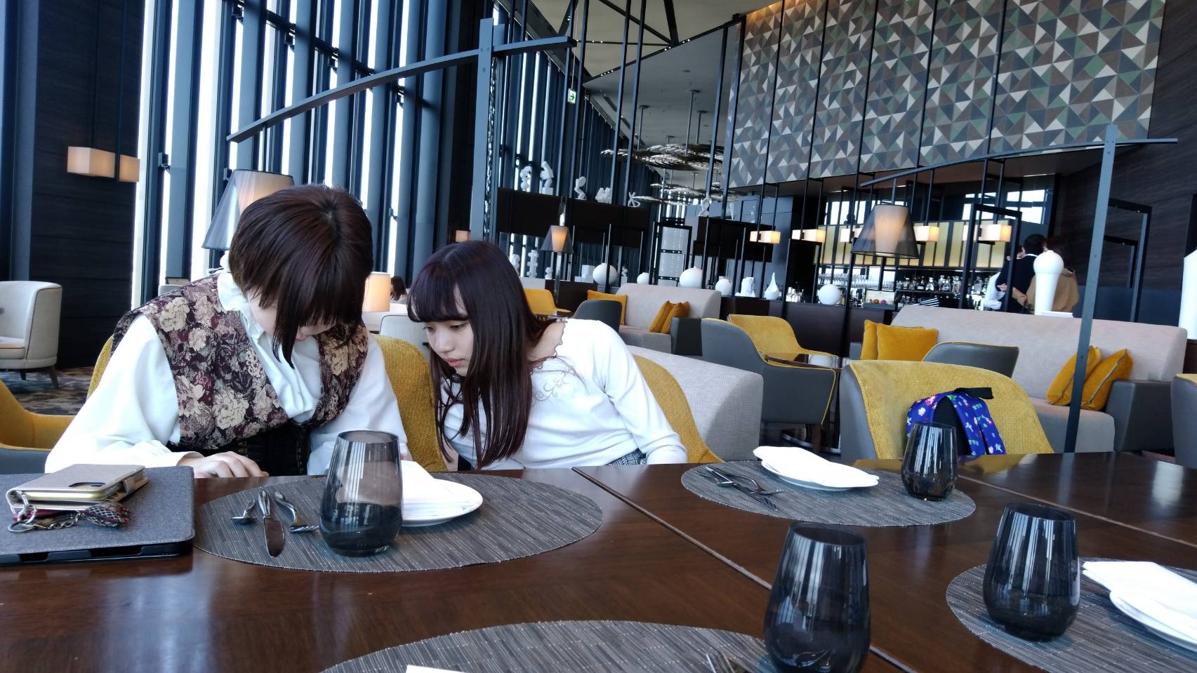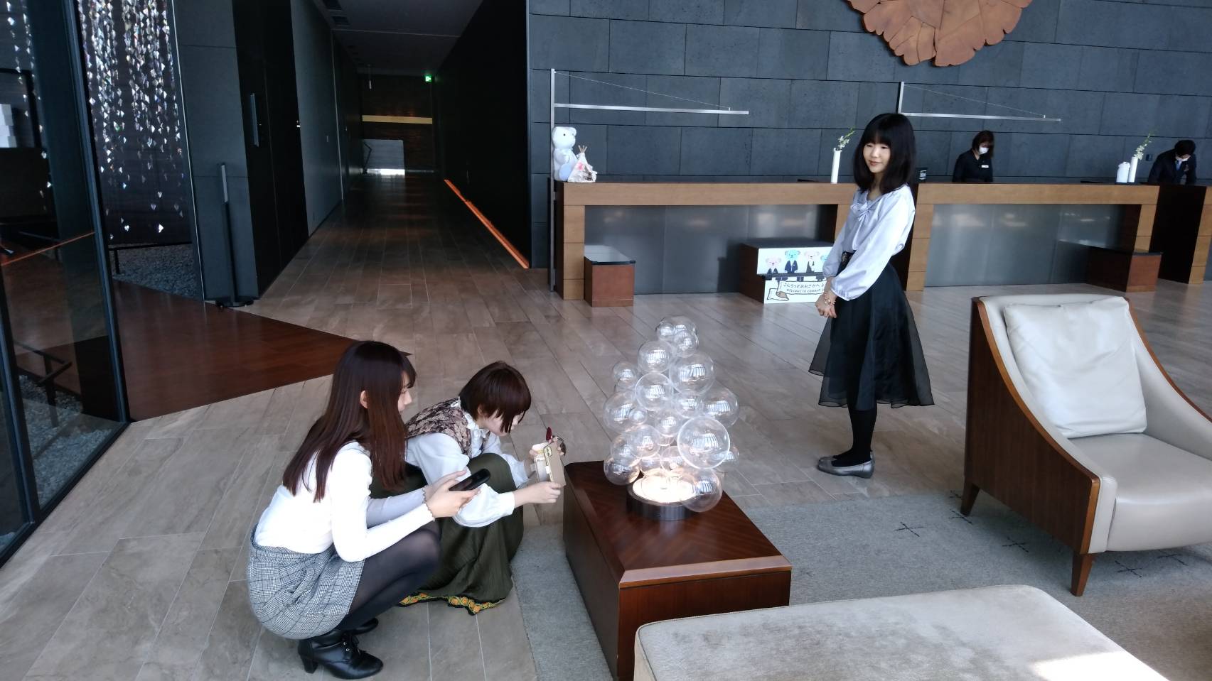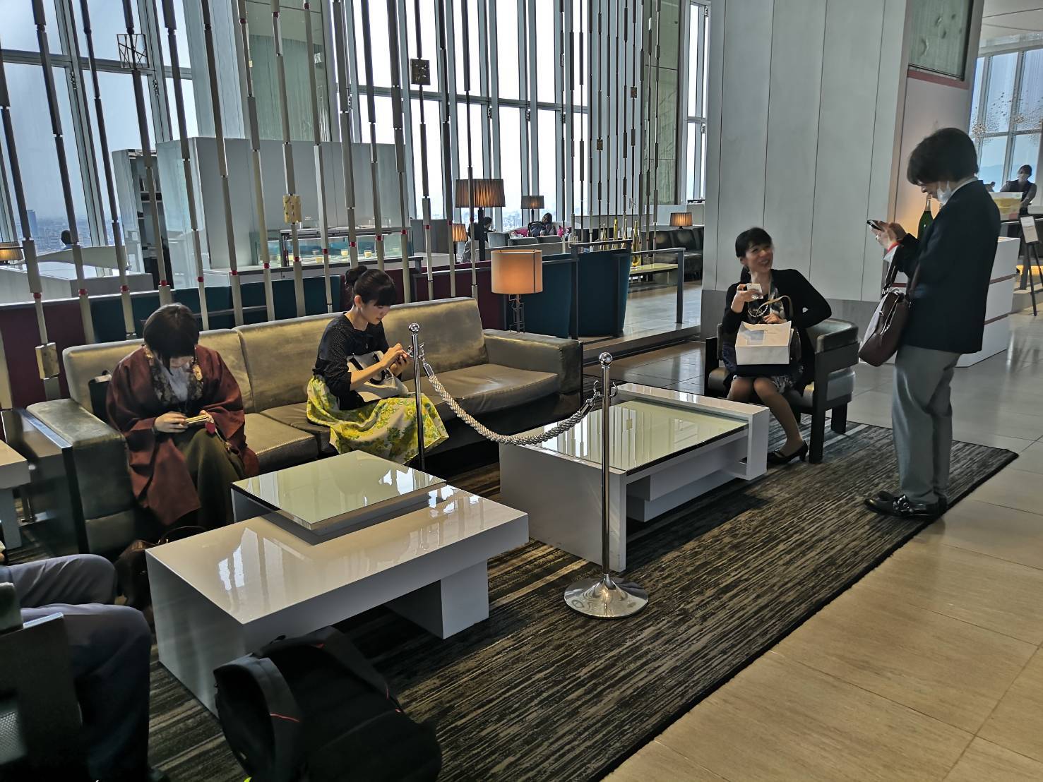 日本で一番高い商業ビル、大阪マリオット都ホテル19階ロビーにて。左端にいるのは、テレビに今引っ張りだこ、スマホを駆使する若手アーティスト萌白さん。いつも空き時間(このときもお客様待ちでした)は、下を向いてスマホやiPadで作業をしていました。