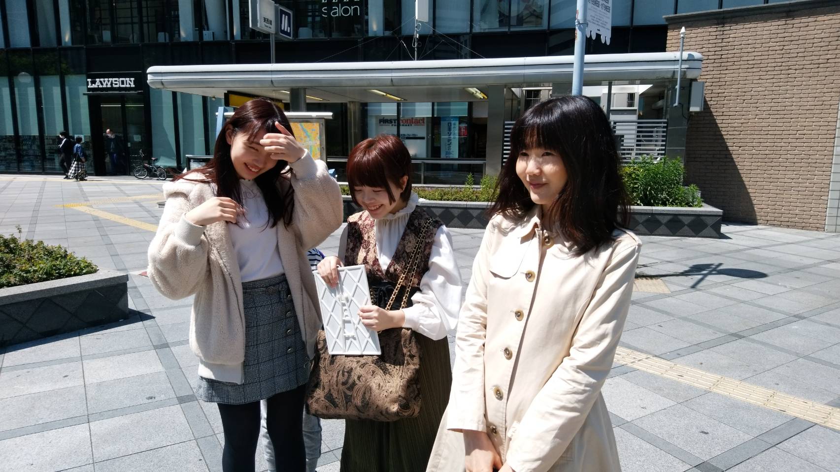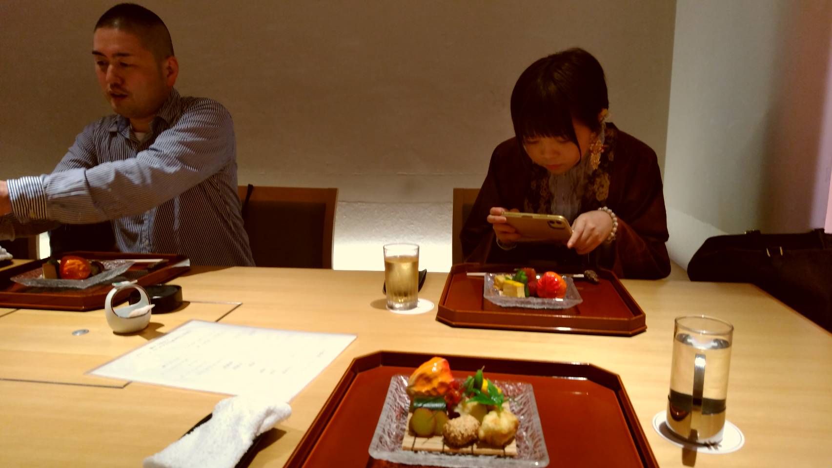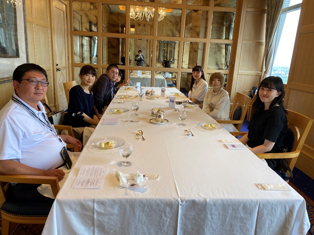 日本で一番高い商業ビル、大阪マリオット都ホテル19階ロビーにて。左端にいるのは、テレビに今引っ張りだこ、スマホを駆使する若手アーティスト萌白さん。いつも空き時間(このときもお客様待ちでした)は、下を向いてスマホやiPadで作業をしていました。