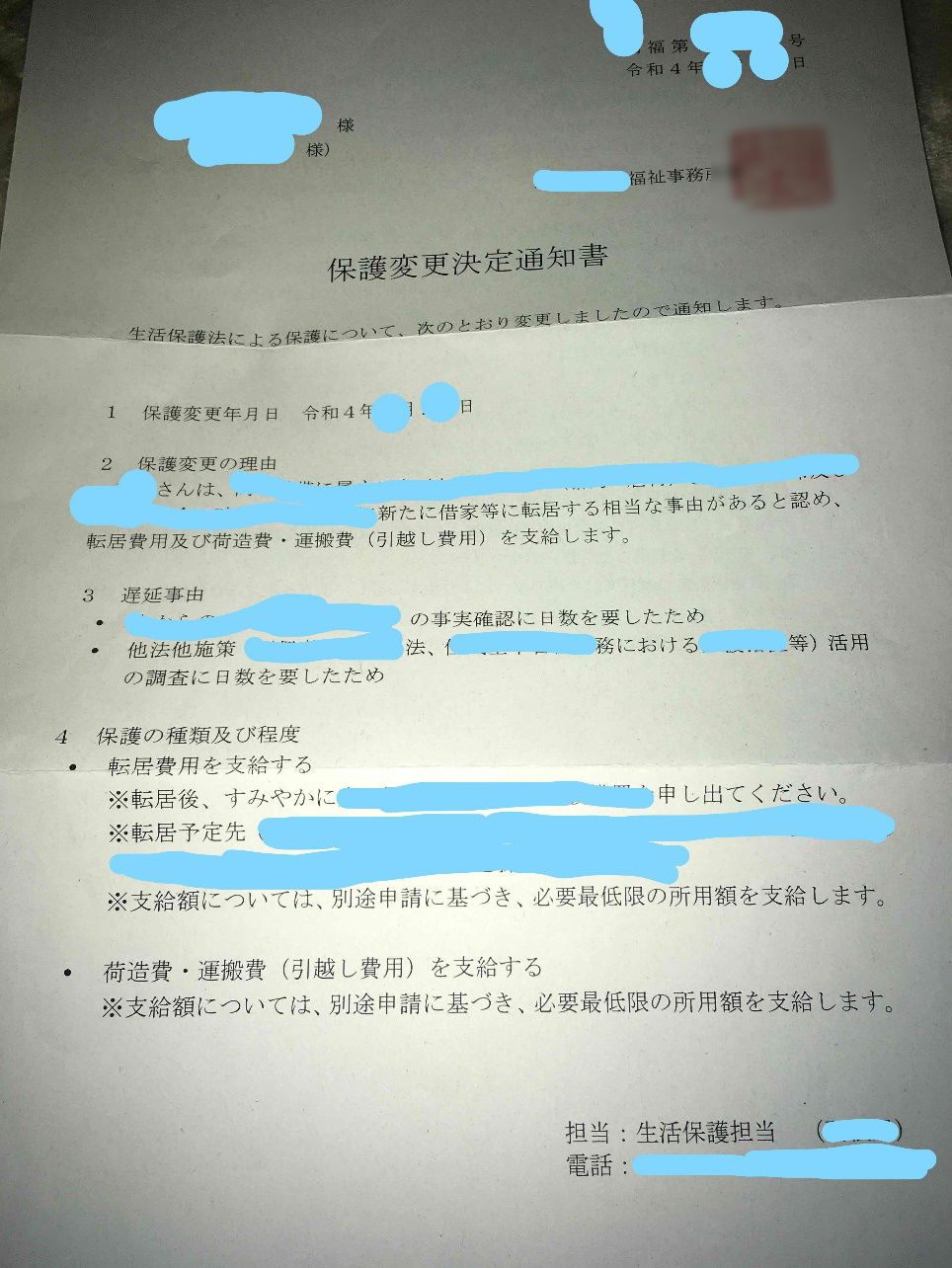 この通知書は、特定行政書士が作成した生活保護を受給している方の引越費用の支給を求める申請書について、引越費用を出しますよという決定文書です。