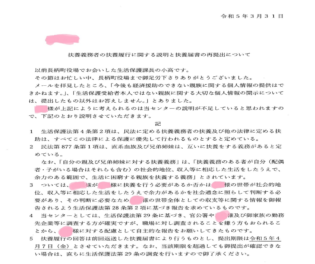 「5.扶養履行の回答は前回返送した扶養届書により行うものとし、提出期限は令和5年4月7日(金)とさせていただきます。なお、当該期限を超過しても御提出が確認できない場合は、直ちに生活保護法第29条の調査を行いますので御了承ください。