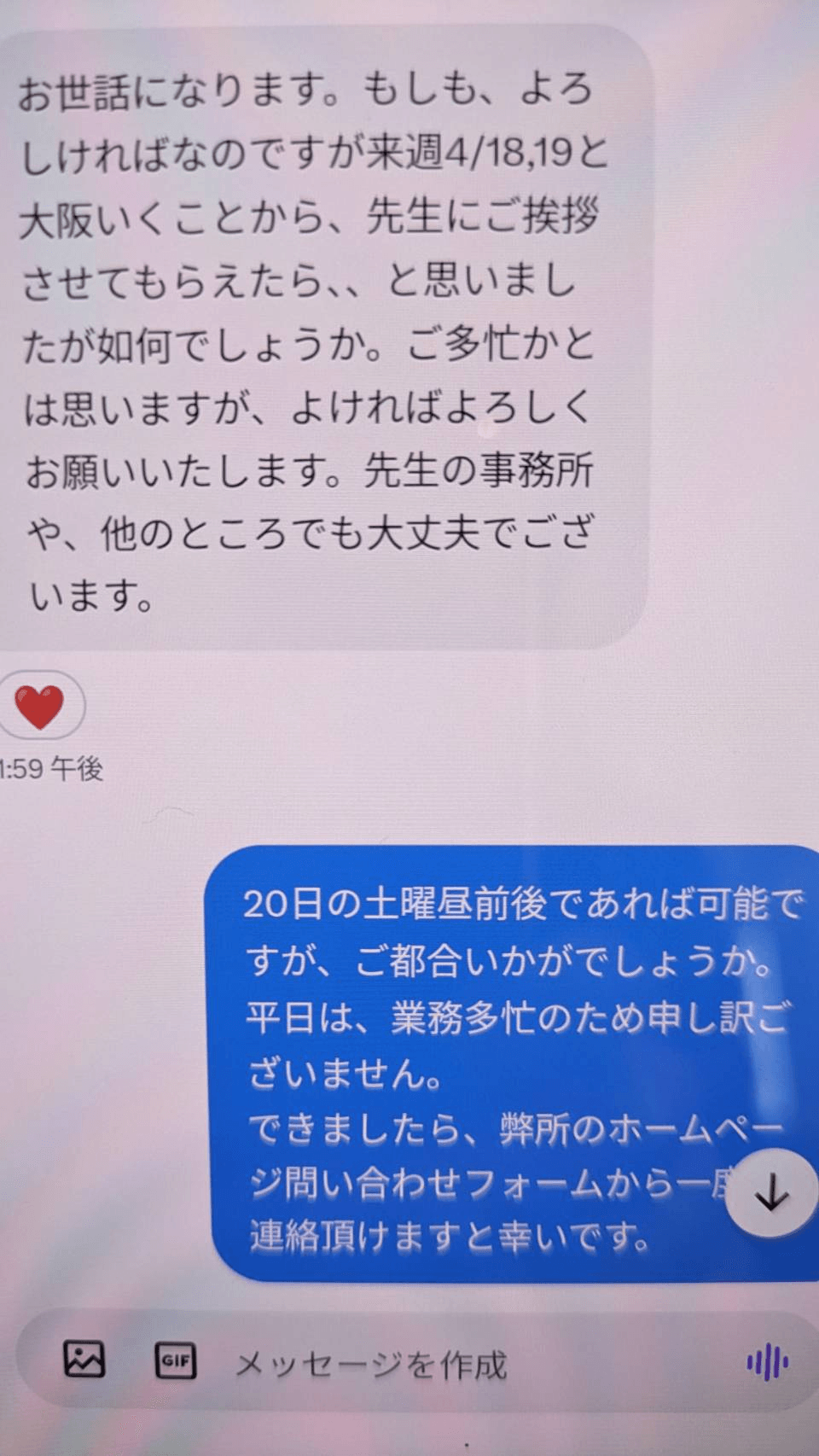 そして、もうお一方、大阪ご出身、関西学院大学ご出身の東京の男性行政書士の先生(業歴は弊所代表以上で企業法務に専門特化されたベテランの先生)からも、平日ご挨拶に・・・というご連絡を頂き、同様に土曜のお昼のご提案をしたところご快諾頂き、ご一緒させていただくことになりました。