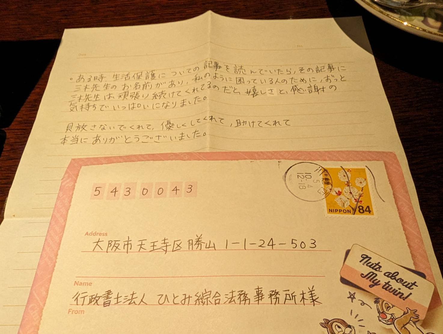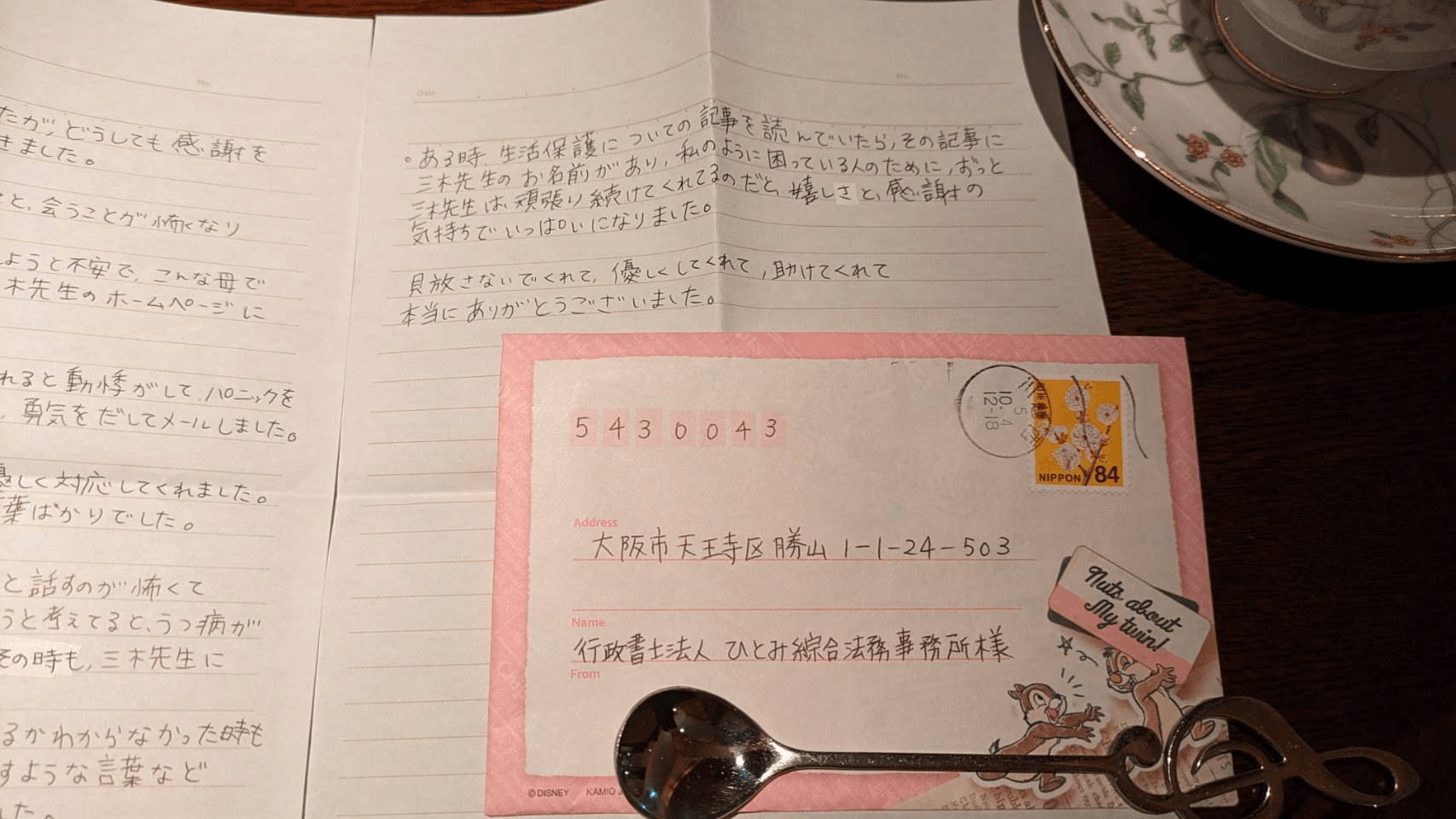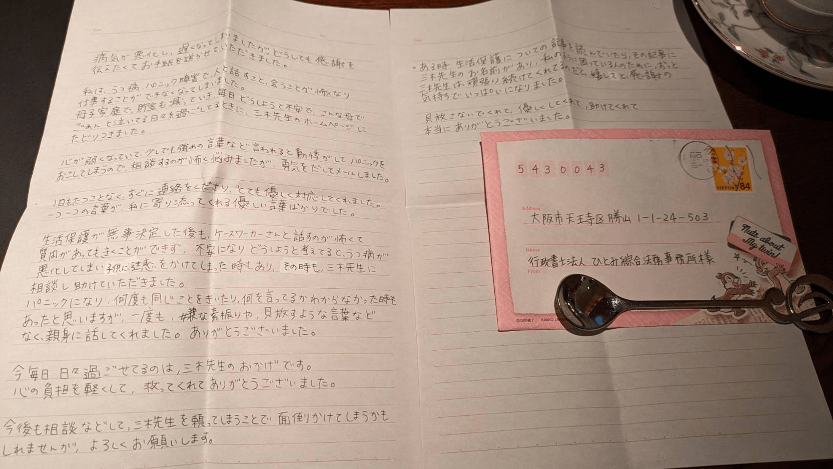病気が悪化し、遅くなってしまいましたが、どうしても感謝を伝えたくて、お手紙を送らせていただきました。
