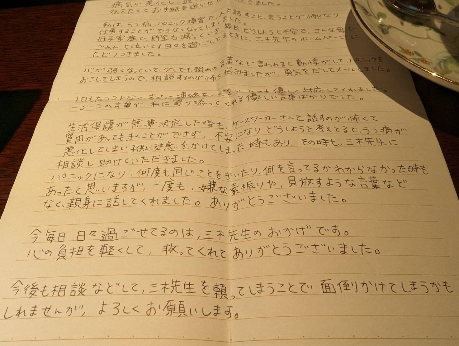 生活保護が無事決定した後も、ケースワーカーさんと話すのが怖くて、質問があってもきくことができず、不安になり、どうしようと考えると、うつ病が悪化してしまい、子どもに迷惑をかけてしまった時もあり、その時も、三木先生に、相談し、助けていただきました。
