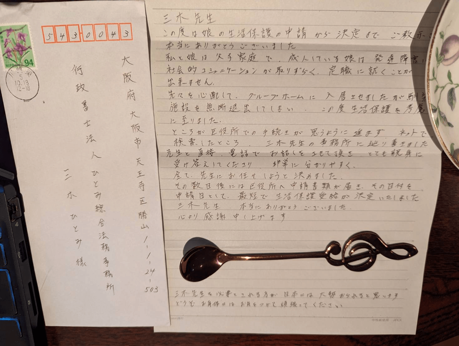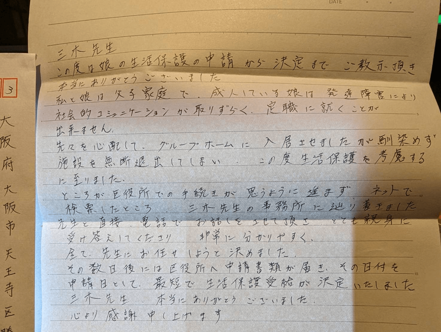 この度は、娘の生活保護申請から決定まで、ご教示頂き本当にありがとうございました。