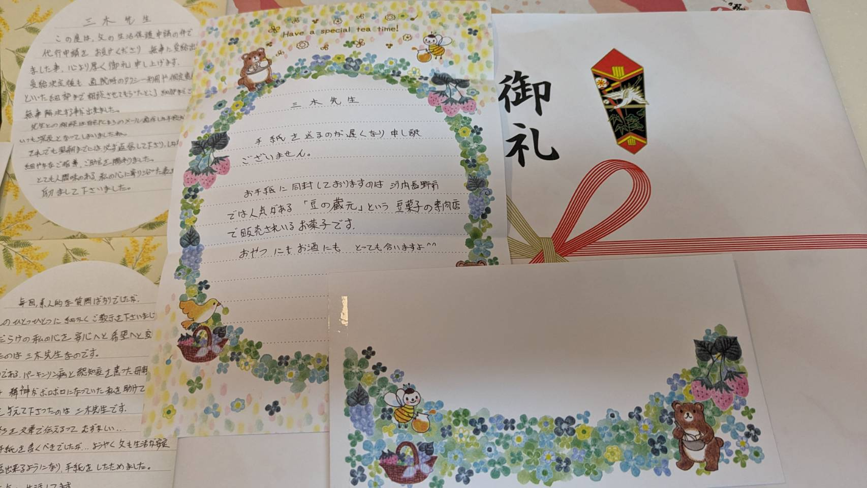 お手紙に同封しておりますのは、河内長野市では人気がある『豆の蔵元』という豆菓子の専門店で販売されているお菓子です。