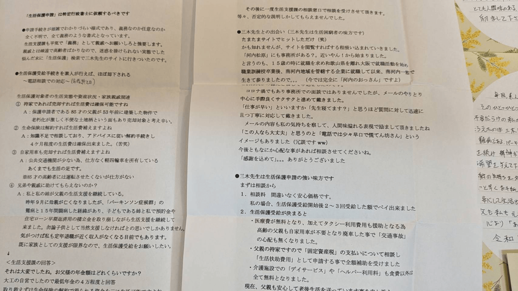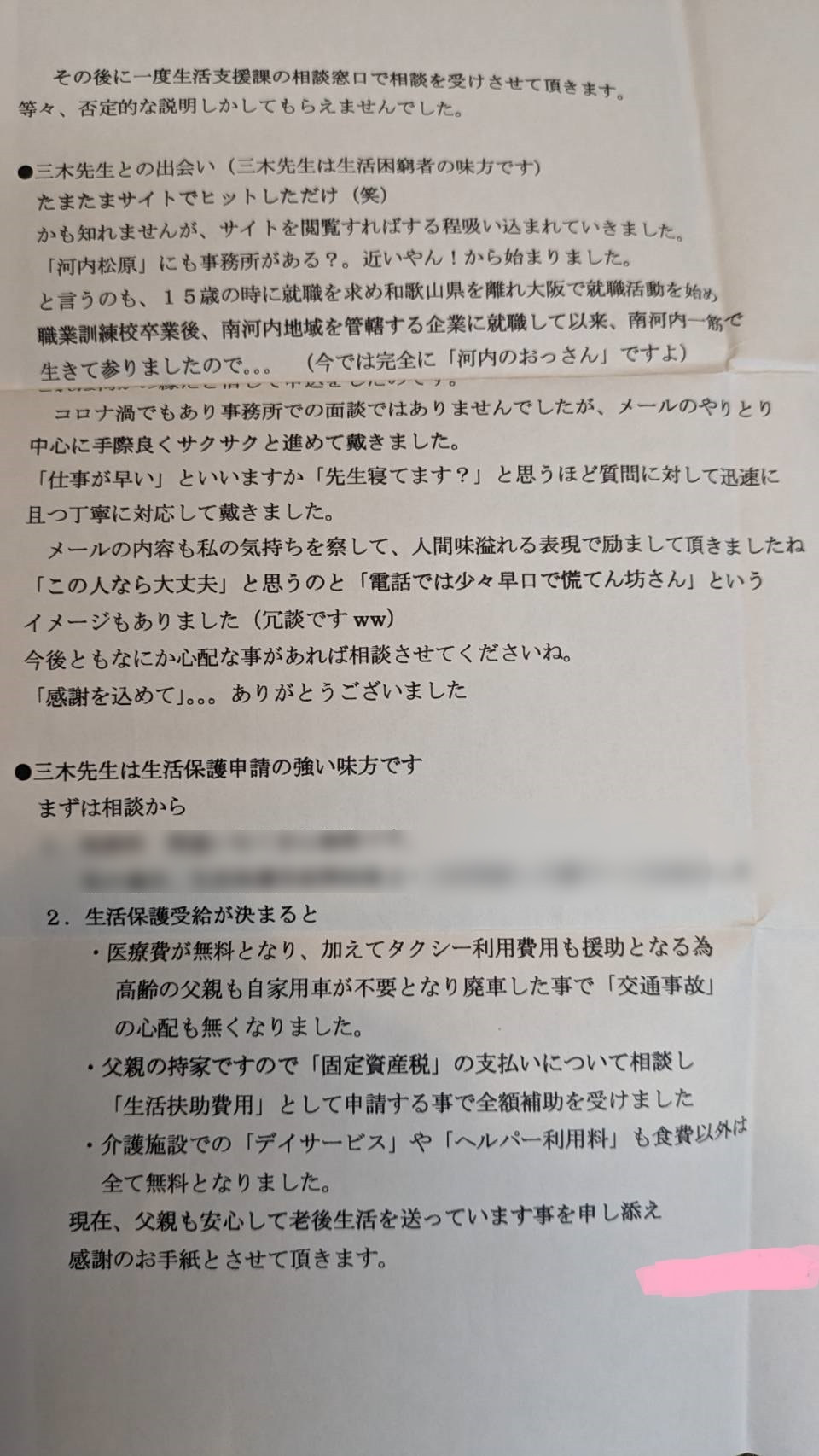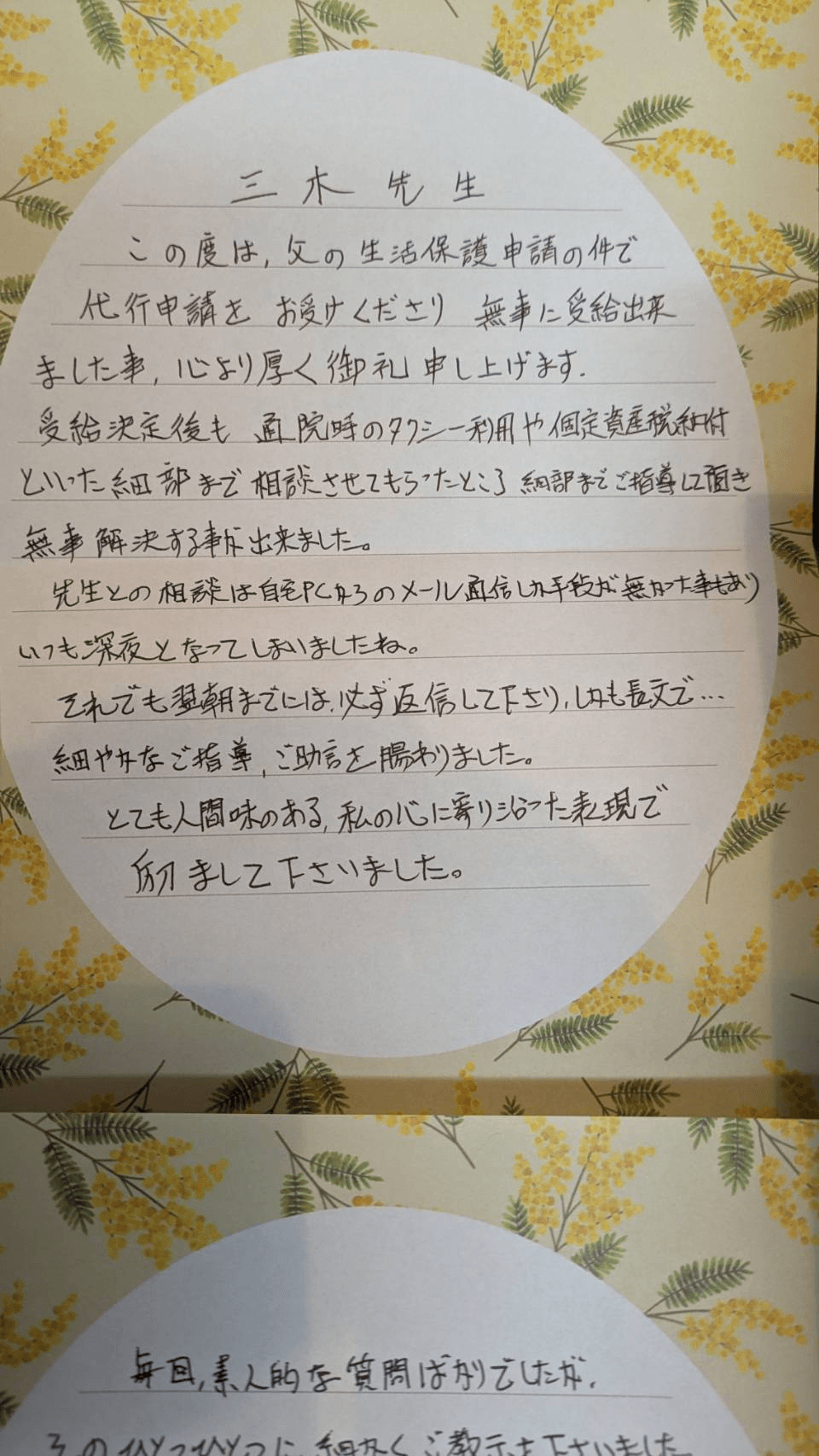 この度は、父の生活保護申請の件で相談サポートをお受けくださり、無事に受給出来ました事、心より厚く御礼申し上げます。