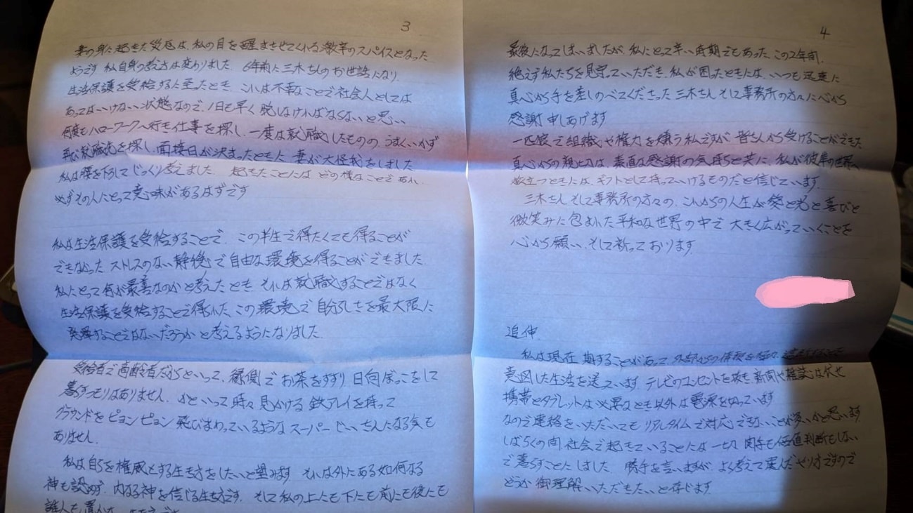 6年前に三木さんのお世話になり、生活保護を受給するに至ったとき、これは不幸なことで社会人としてはあってはいけない状態なので、1日も早く脱しなければならないと思い、何度もハローワークへ行き仕事を探し、一度は就職したもののうまくいかず、再び転職先を探し、面接日が決まったときに妻が大怪我をしました。私は腰を下ろしてじっくり考えました。起きたことは、どの様なことであれ、必ずその人にとって意味があるはずです。