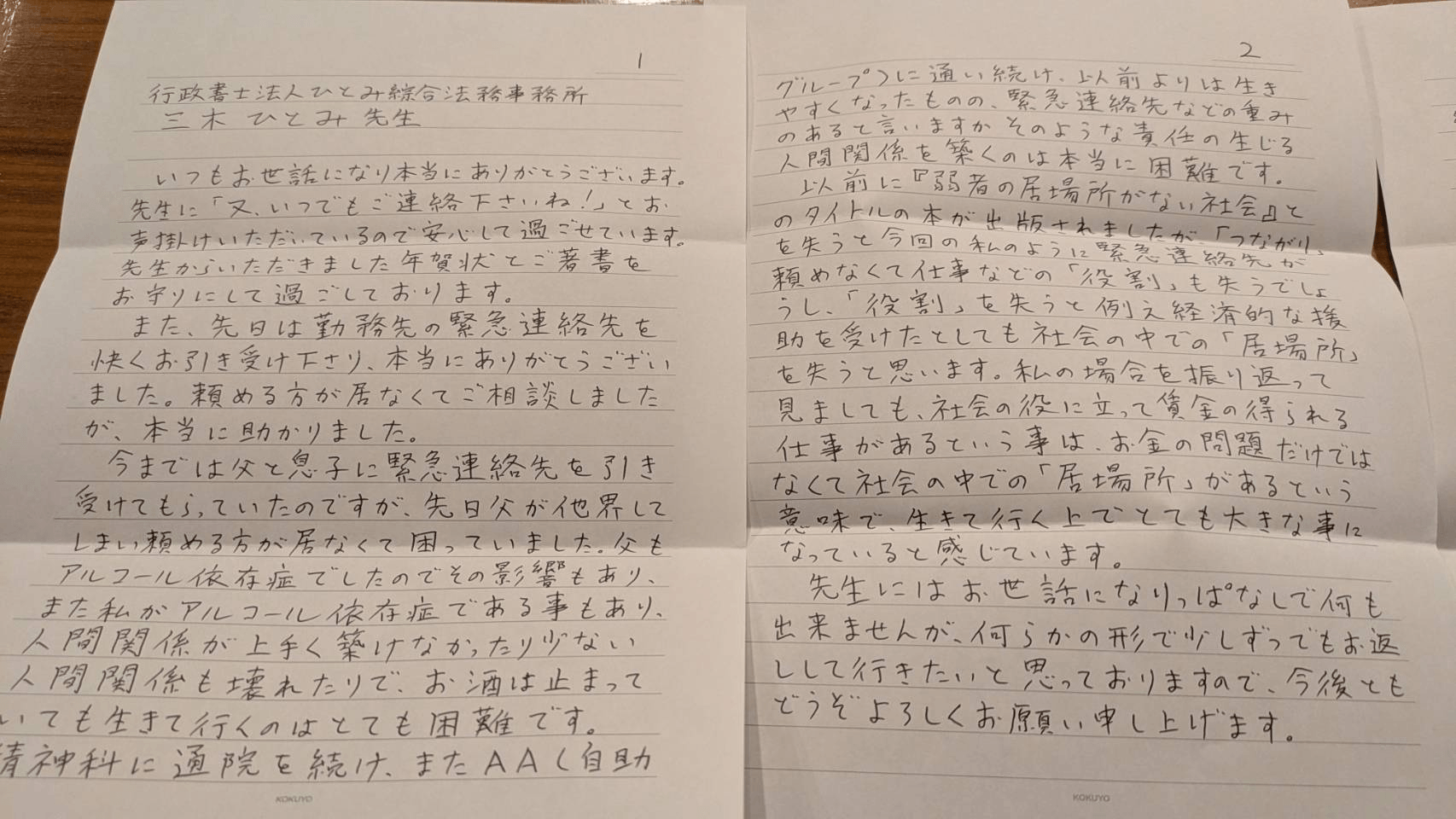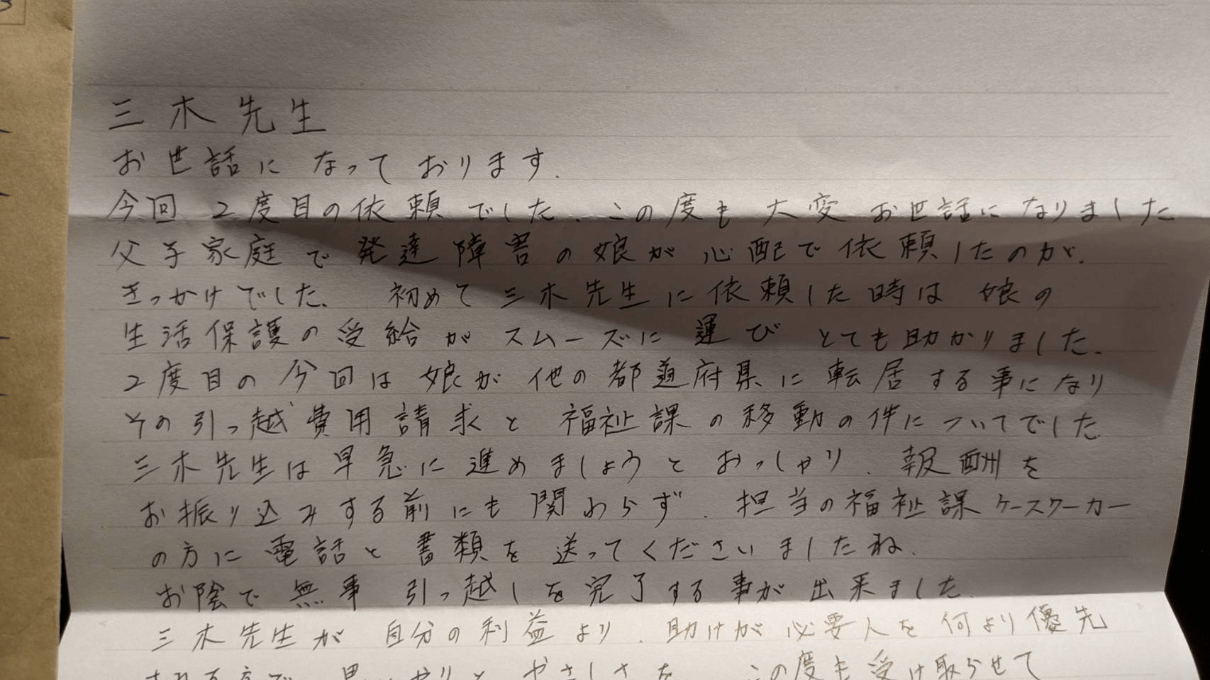 初めて三木先生に依頼した時は、娘の生活保護の受給がスムーズに運び、とても助かりました。