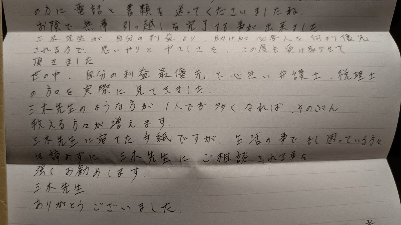 三木先生は、早急に進めましょうとおっしゃり、報酬をお振込みする前ににもかかわらず、担当の福祉課ケースワーカーの方に電話と書類を送ってくださいましたね。