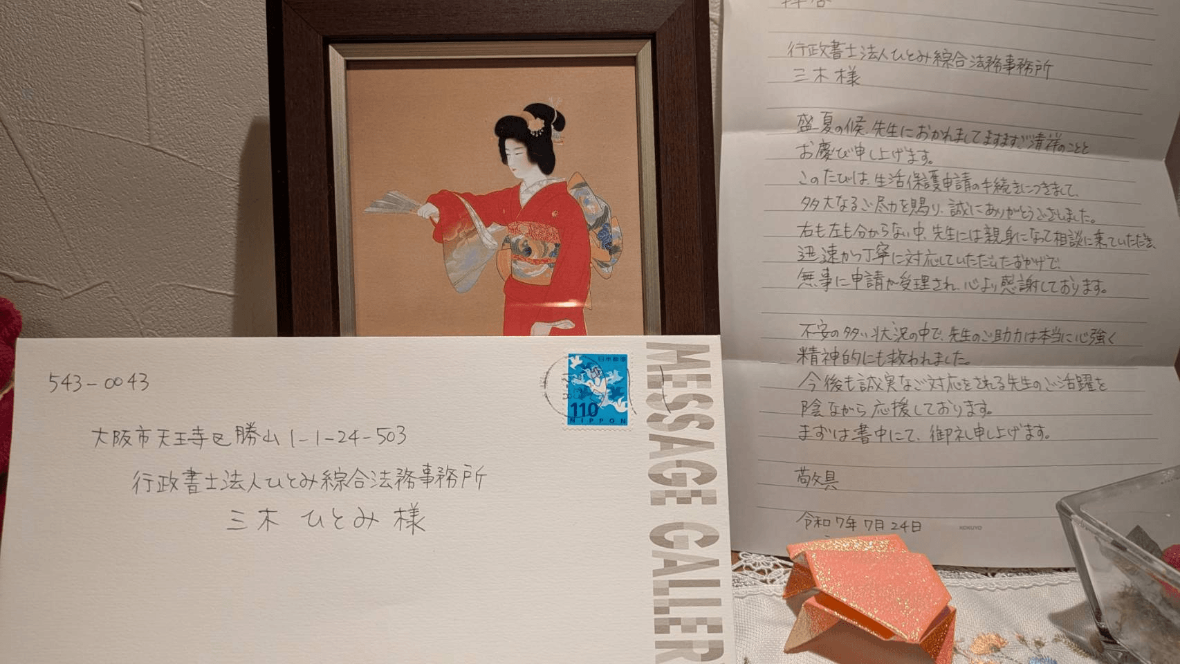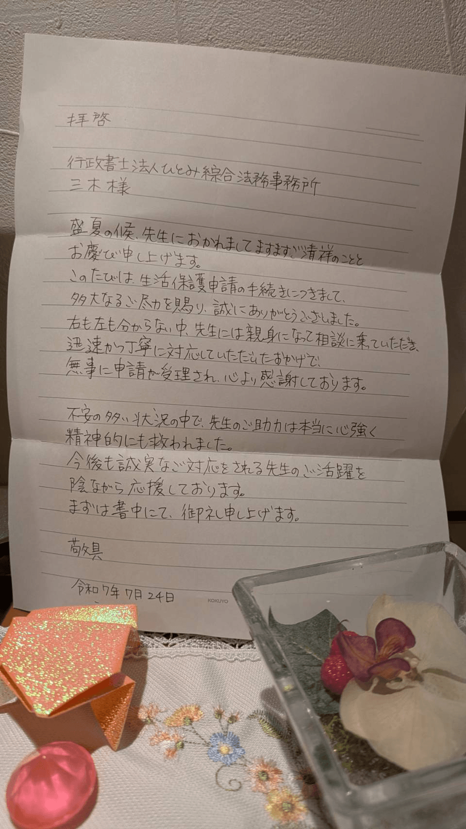 このたびは、生活保護申請の手続きにつきましhて、多大なるご尽力を賜り、誠にありがとうございました。