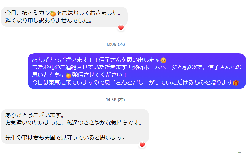 We will cherish the heartfelt mandarins and persimmons you gave us, and all the office staff will enjoy them while remembering Nobuko.