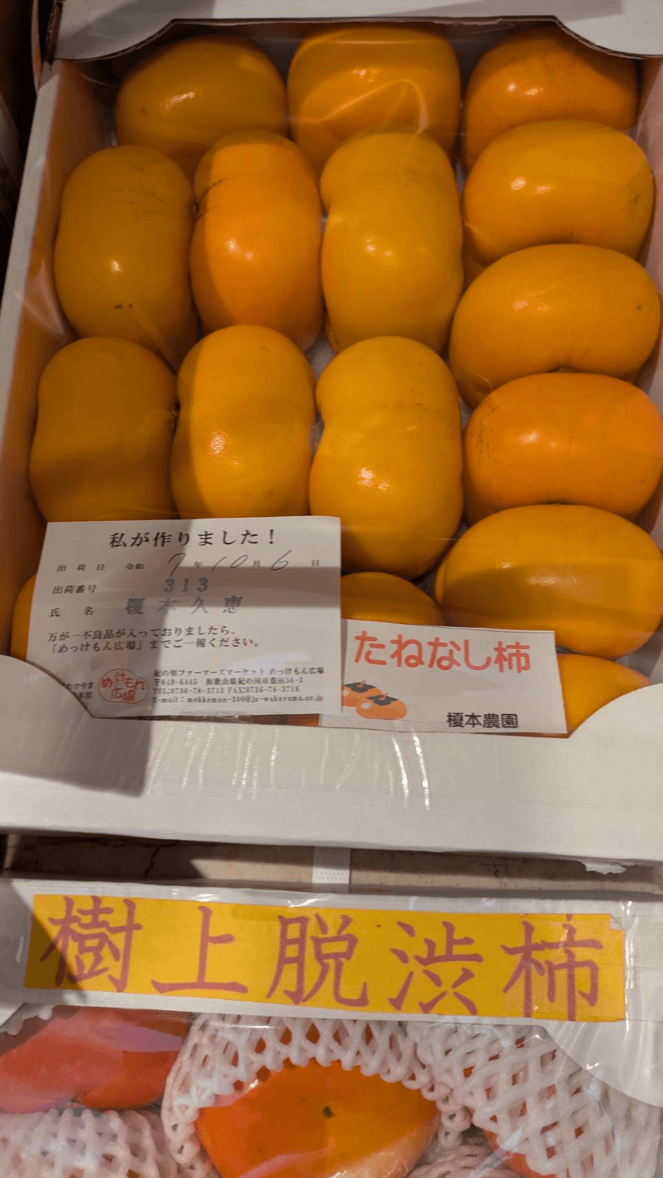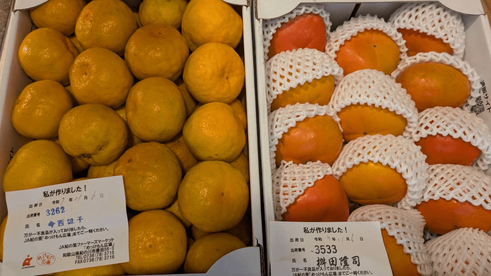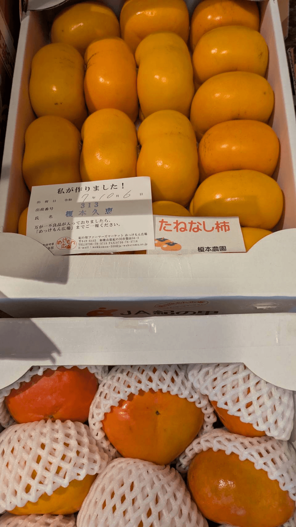 When we opened the box, along with the scent of autumn from Wakayama, there was a mountain of mandarins and persimmons. The moment we saw them, the gentle smile of Nobuko in her lifetime suddenly came to mind, and our heart felt warm.