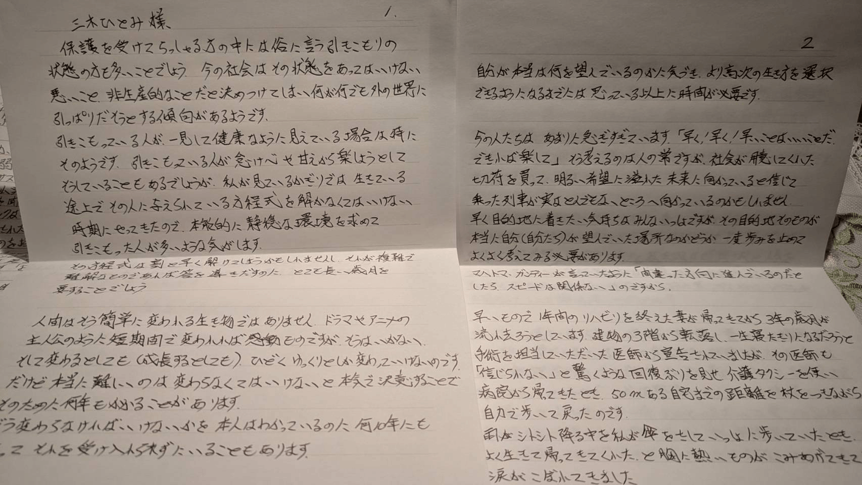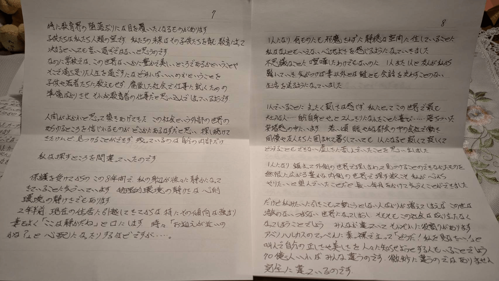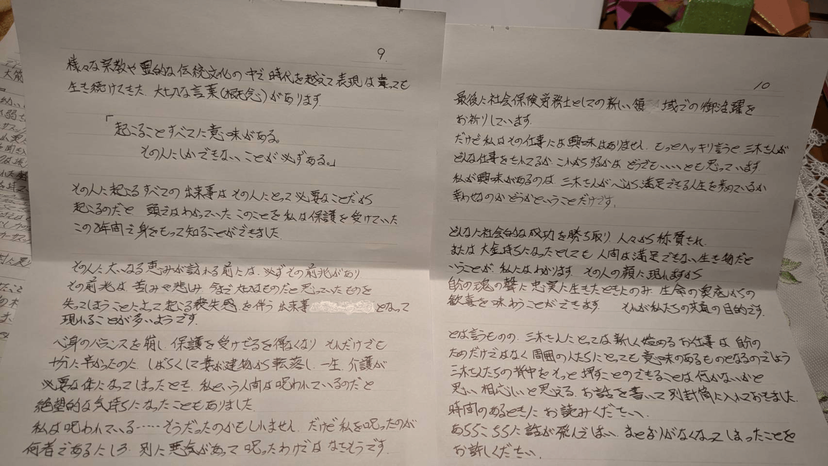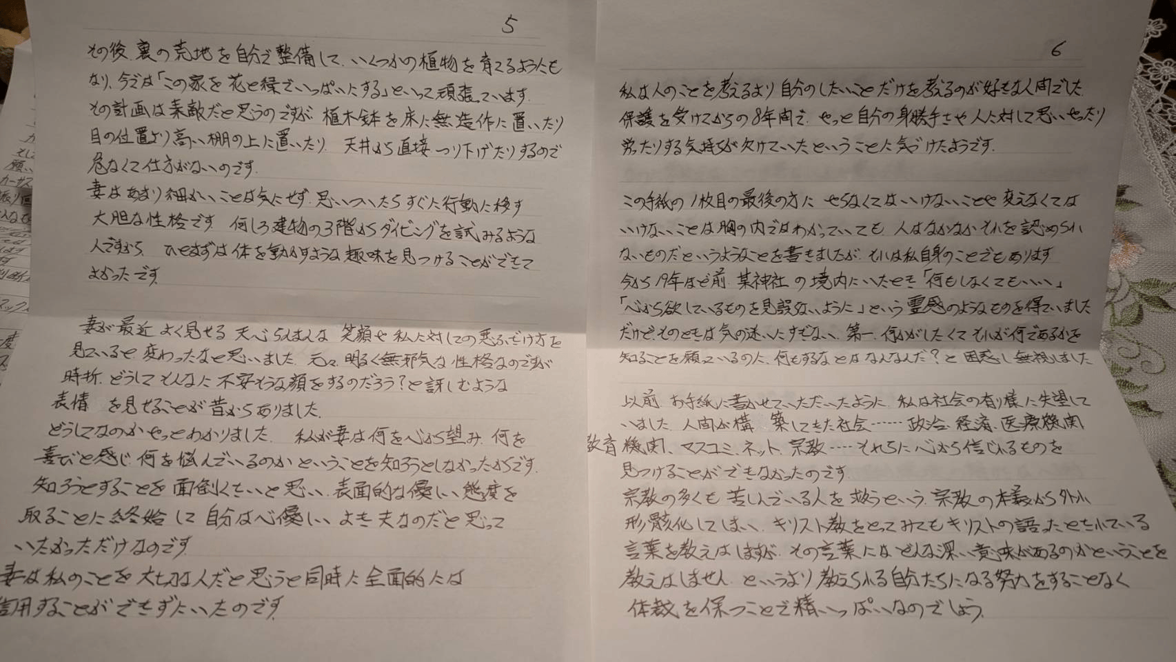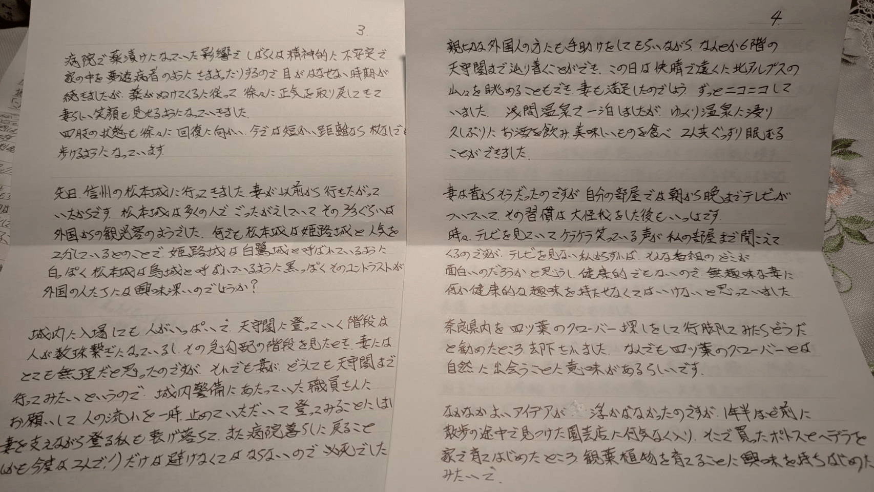 奈良県で70代の奥様の老々介護をされるO様の壮絶な体験、そこから生まれた思索を10枚以上の便せんに綴ってくださいました。