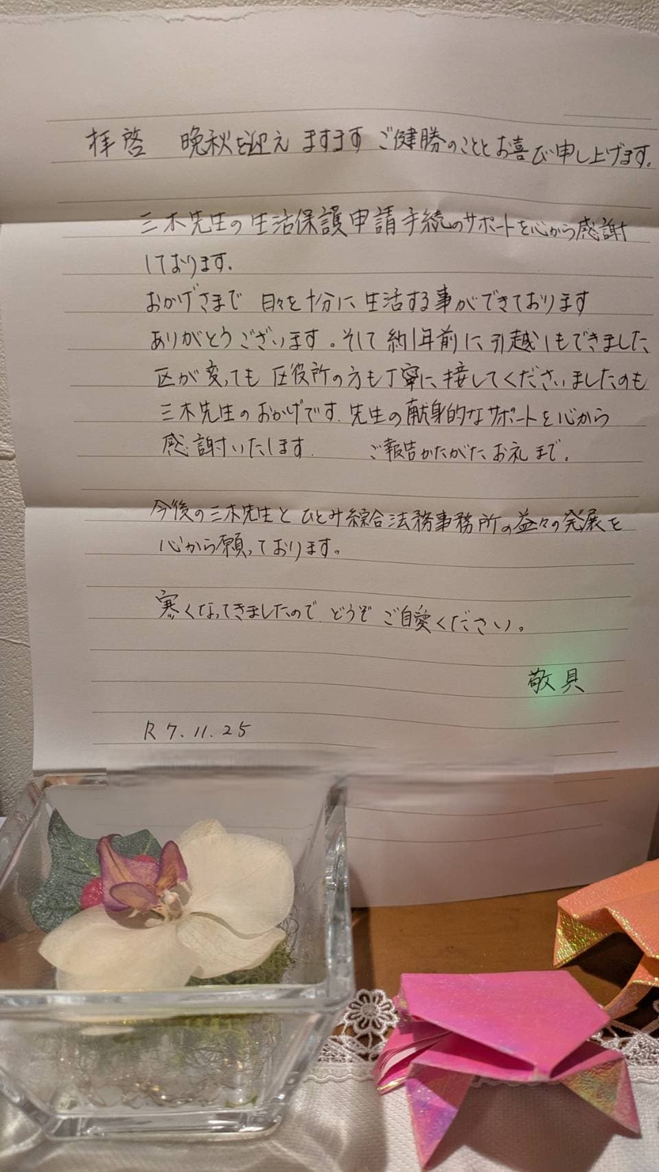 (数年前、お子さんお二人を抱えたシングルマザーのT様からご相談いただき、無事、生活保護受給に至りました。お引越しをされたことから、新たなご住所のお知らせと共にお久しぶりのお便り嬉しく拝読しました。ありがとうございます。)