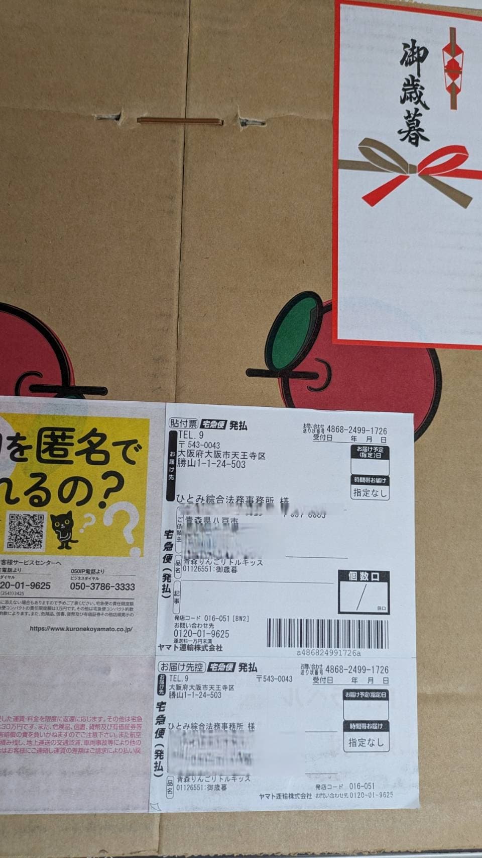 2025-12-04 / 最終更新日 : 2025-12-04 ひとみ綜合法務事務所 青森県・八戸からリンゴが届きました 2017年から毎年、この時期に青森・八戸からリンゴが届きます。 送ってくださるのは、弟さんの申請のご依頼を頂いた優しいお兄様。 FacebookXBlueskyHatenaCopy コメントを残す コメントをキャンセルメールアドレスが公開されることはありません。 ※ が付いている欄は必須項目ですコメント ※ 名前 ※ メール ※ サイト 上に表示された文字を入力してください。 Δ