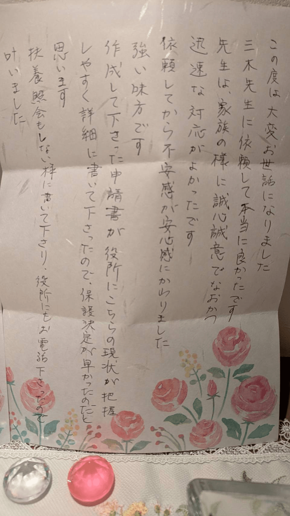 作成して下さった申請書が、役所にこちらの現状が把握しやすく詳細に書いて下さっていたので、保護決定が早かったのだと思います。