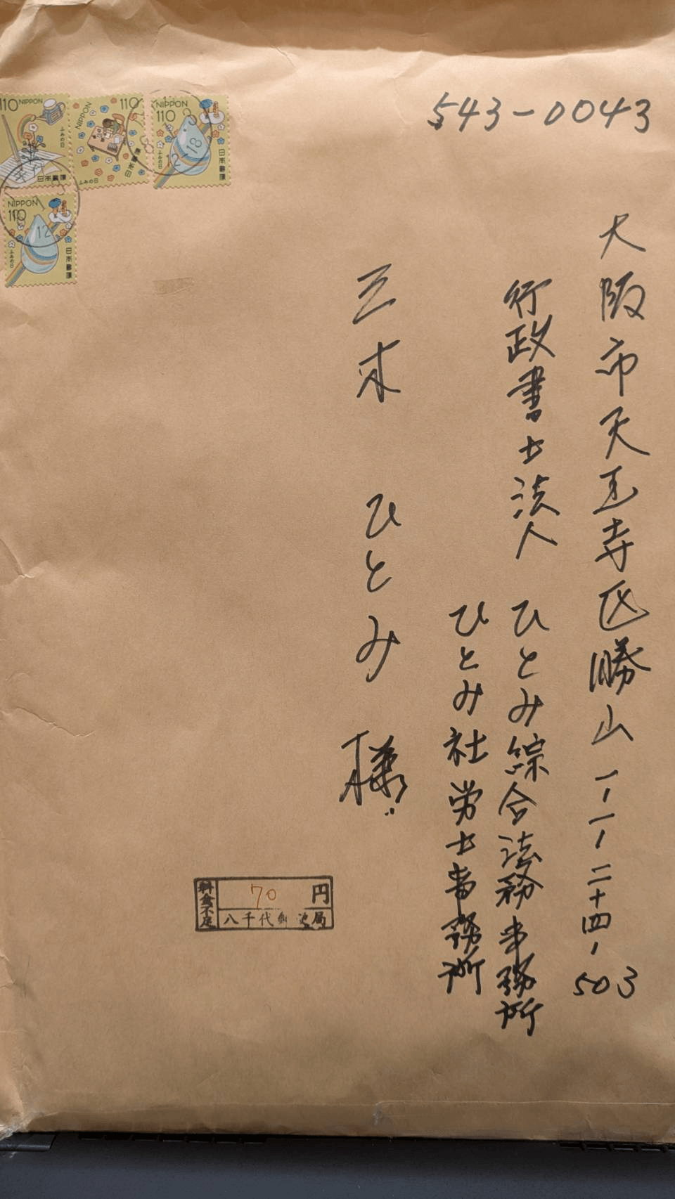 令和8年仕事はじめに、行政書士法人ひとみ綜合法務事務所にぎっしり重みのある封筒が届きました。千葉県にお住いの女性K様(80代)からでした。