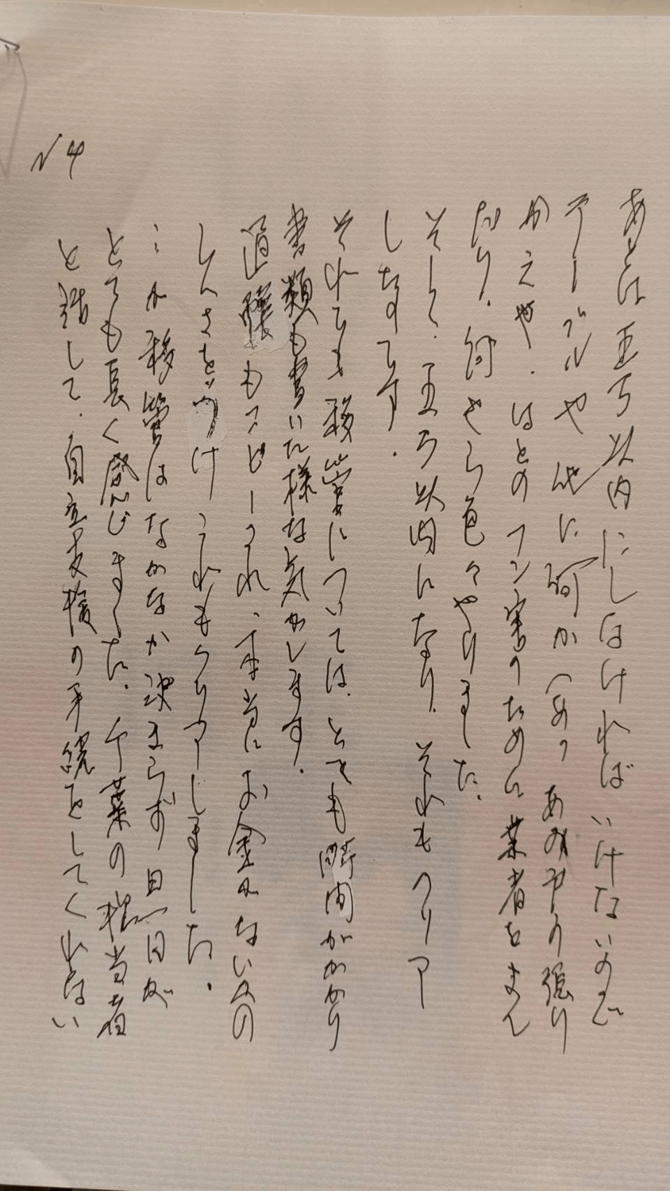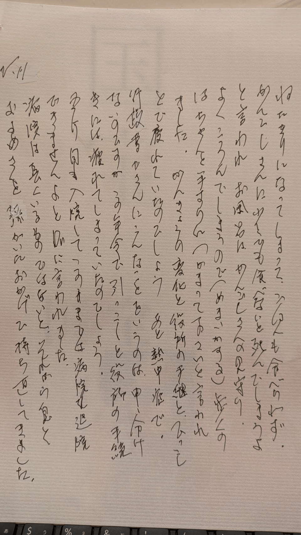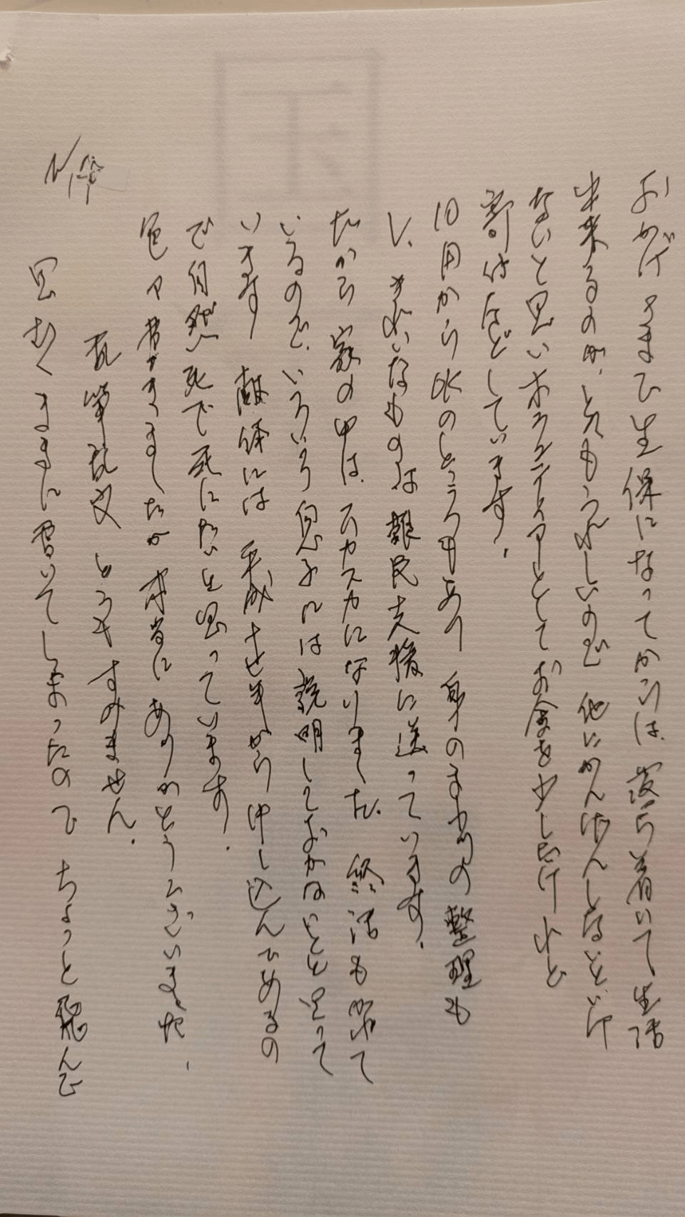 病院では、7/10より5か月入院し、最初の二カ月は、ねたきりになってしまって、なんにも食べられず、(判読できず)さんに、少しでも食べないと、死んでしまうよと言われ、お風呂は、かんごしさんの見守り、よくころんでしまうので(めまいがする)歩くのは、ちゃんと手すりにつかまって下さいと言われました。かんきょうの変化と、役所の手続きと、ひっこしとで、疲れていたのでしょう。あと、熱中症で、行政書士さんにこんなことをいうのは申し訳ないのですが、この年齢で、引越しと役所の手続きには、疲れてしまっていたのでしょう。