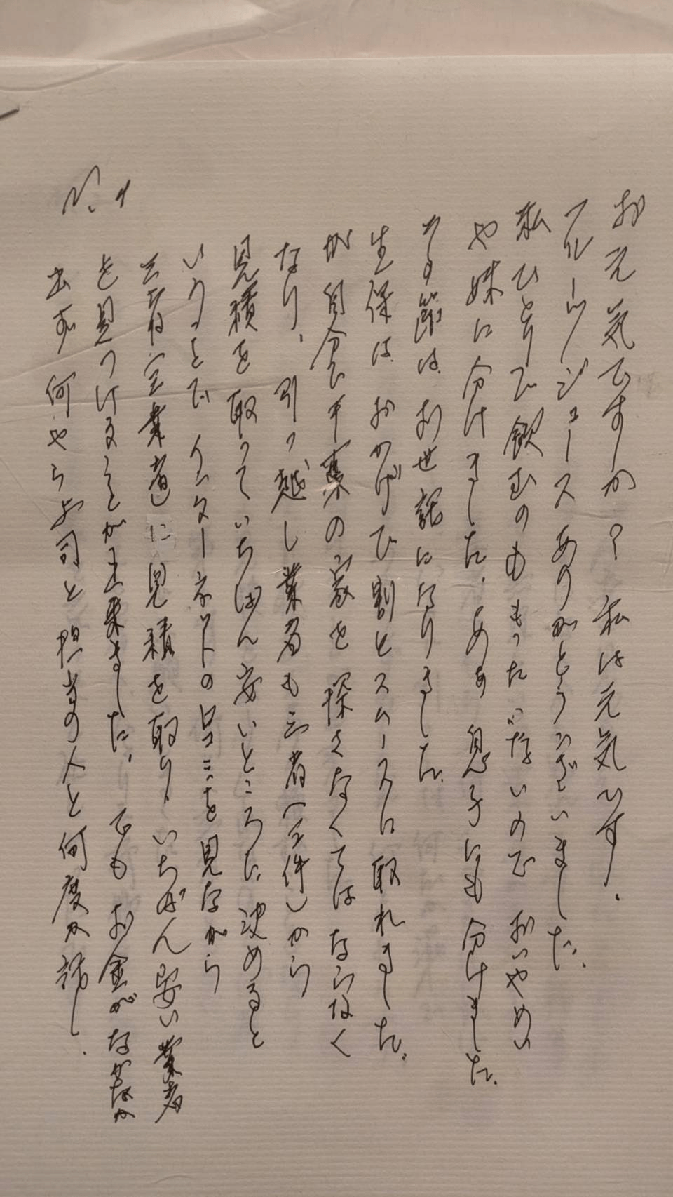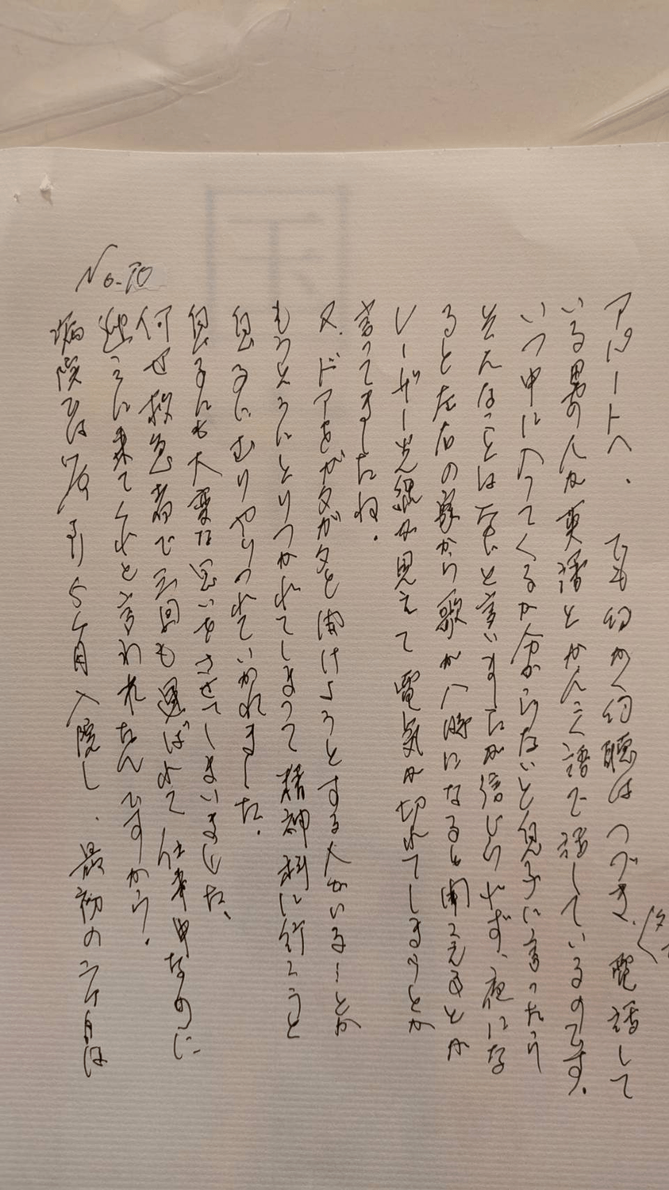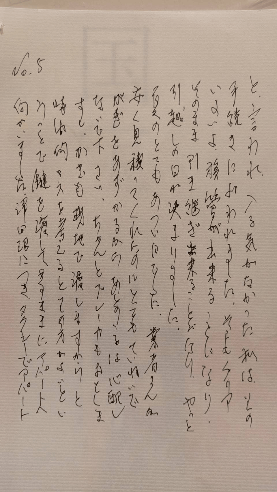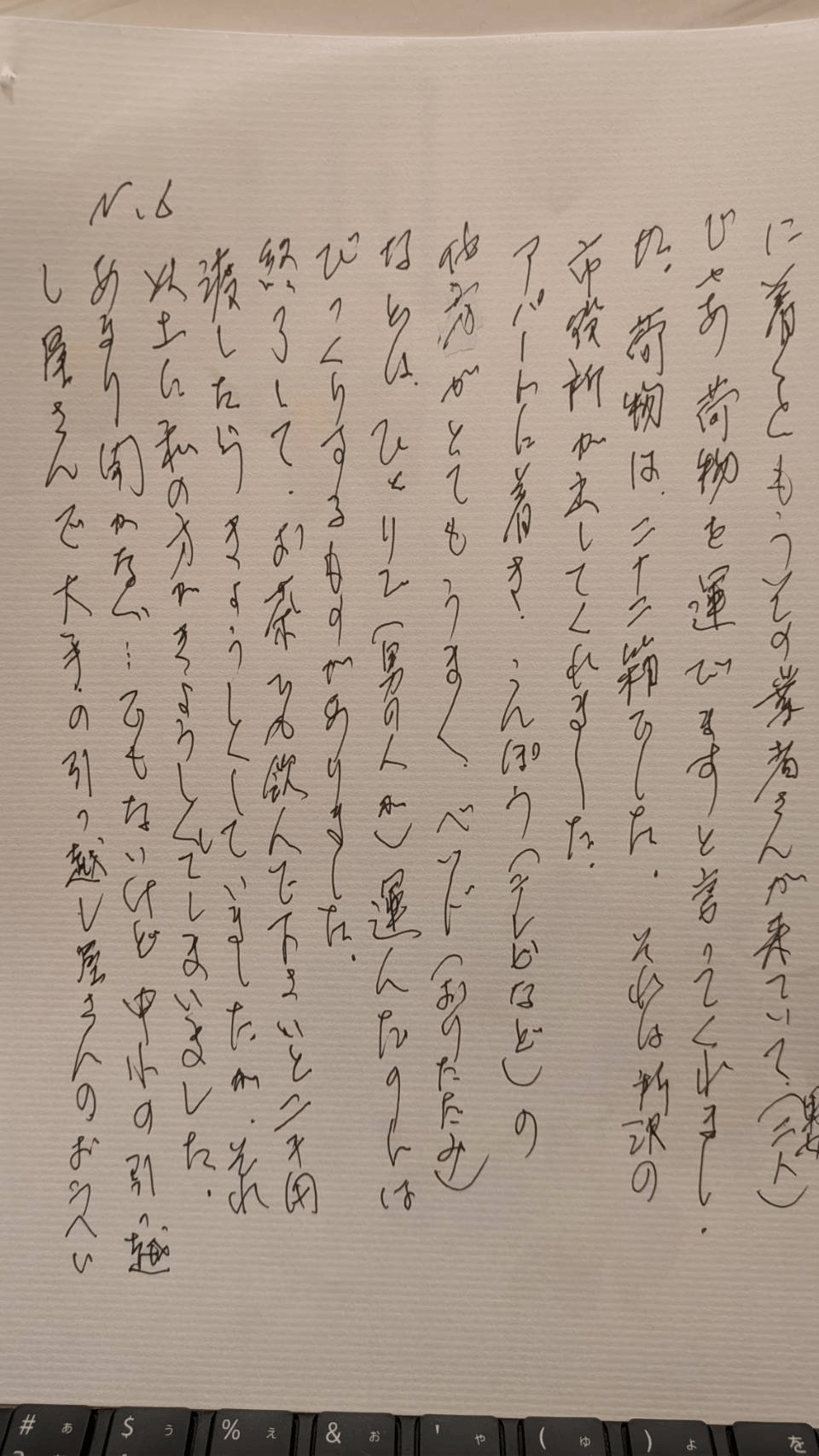 夏の、とてもあつい日でした。業者さんが、安く見積もってくれたのに、とてもていねいで、かぎをあずかるから、あとのことは心配しないで下さい、ちゃんとブレーカーも落としますと、かぎも現地で渡しますからと、時間的ロスを考えるとその方がよいということで、鍵を渡して、(解読できず・・・)アパートへ向かいました。ずいぶん遅くにつき、タクシーでアパートに着くと、もうその業者さんが来ていて(男女二人)じゃあ、荷物を運びますと言ってくれましたが、荷物は二十二箱でした。それは、(固有名詞のため伏せます)の市役所が出してくれました。