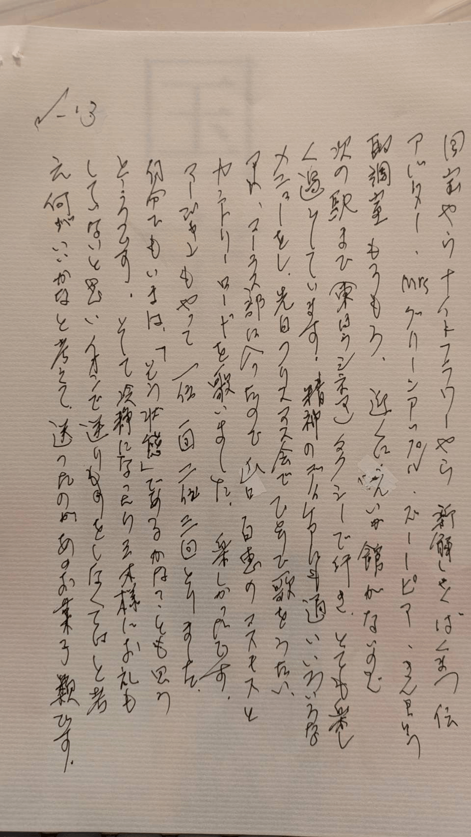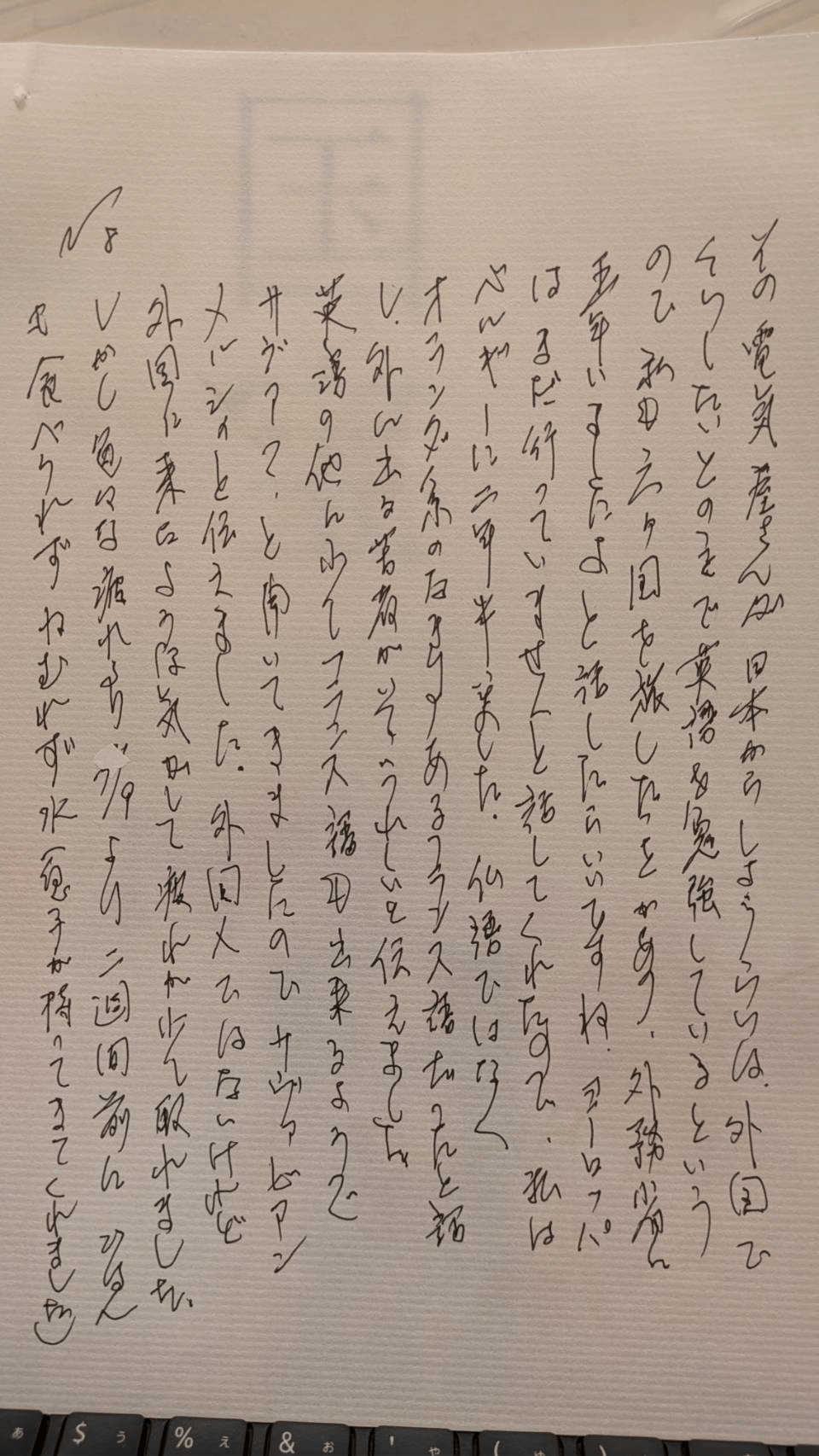 その電気屋さんが、日本からしょうらいは、外国でくらしたいとのことで、英語を勉強しているというので、私も三か国を旅した(判読できず)外務省に五年いましたよと話したら、いいですね、ヨーロッパにはまだ行っていませんと話してくれたので、私はベルギーに二年半いました、フランス語ではなく、オランダ系のなまりもあるフランス語だったと話し、外に出る若者がいてうれしいと伝えました。