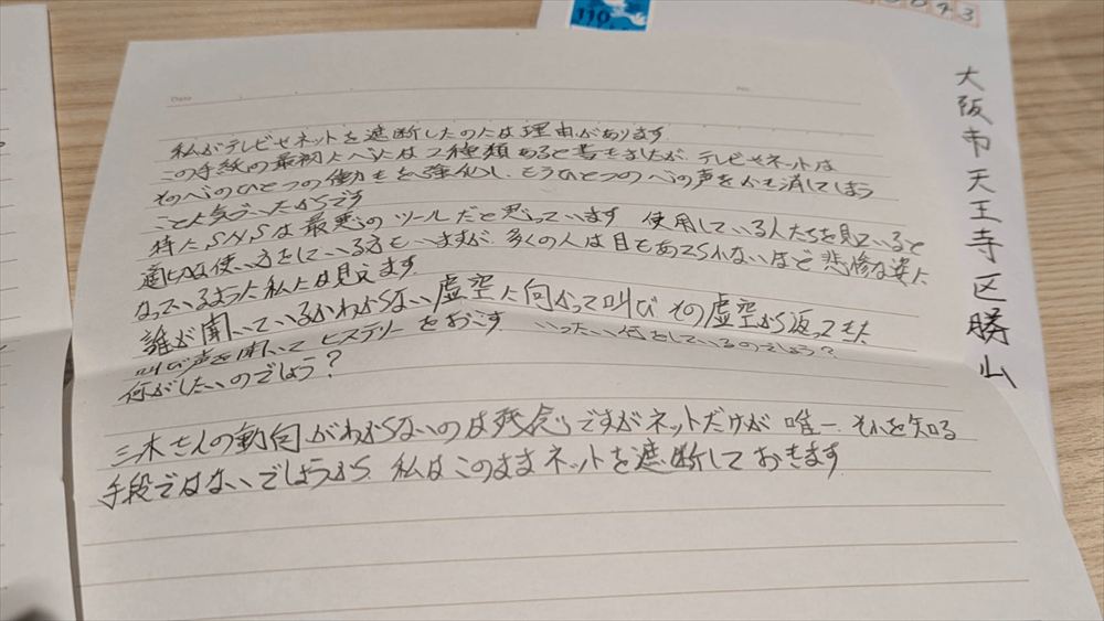 「テレビやネットを断捨離」されている、奈良県のO様からお手紙が届きました。