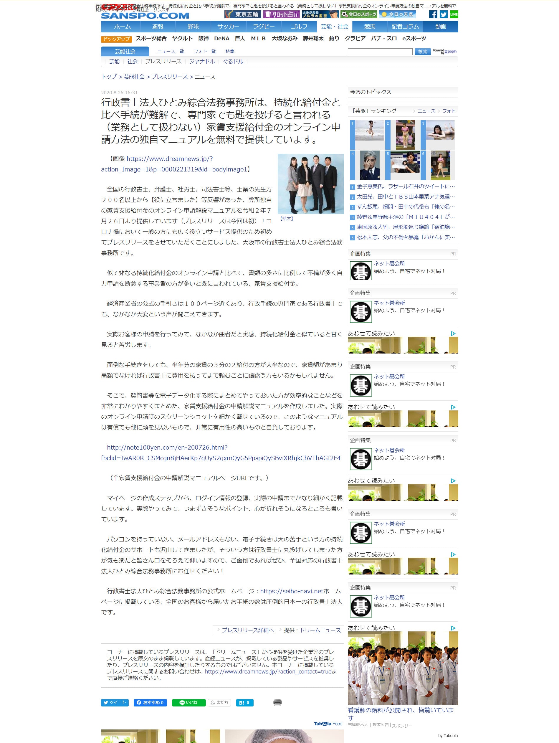 2020-08-29 / 最終更新日 : 2020-08-30 ひとみ綜合法務事務所 SANSPO.COMにプレスリリースが掲載されました 2020/8/26 産経デジタルのWEBメディア:SANSPO.COMにプレスリリースが掲載されました。 →行政書士法人ひとみ綜合法務事務所は、持続化給付金と比べ手続が難解で、専門家でも匙を投げると言われる(業務として扱わない)家賃支援給付金のオンライン申請方法の独自マニュアルを無料で提供しています。 – 芸能社会 – SANSPO.COM(サンスポ) FacebookXBlueskyHatenaCopy
