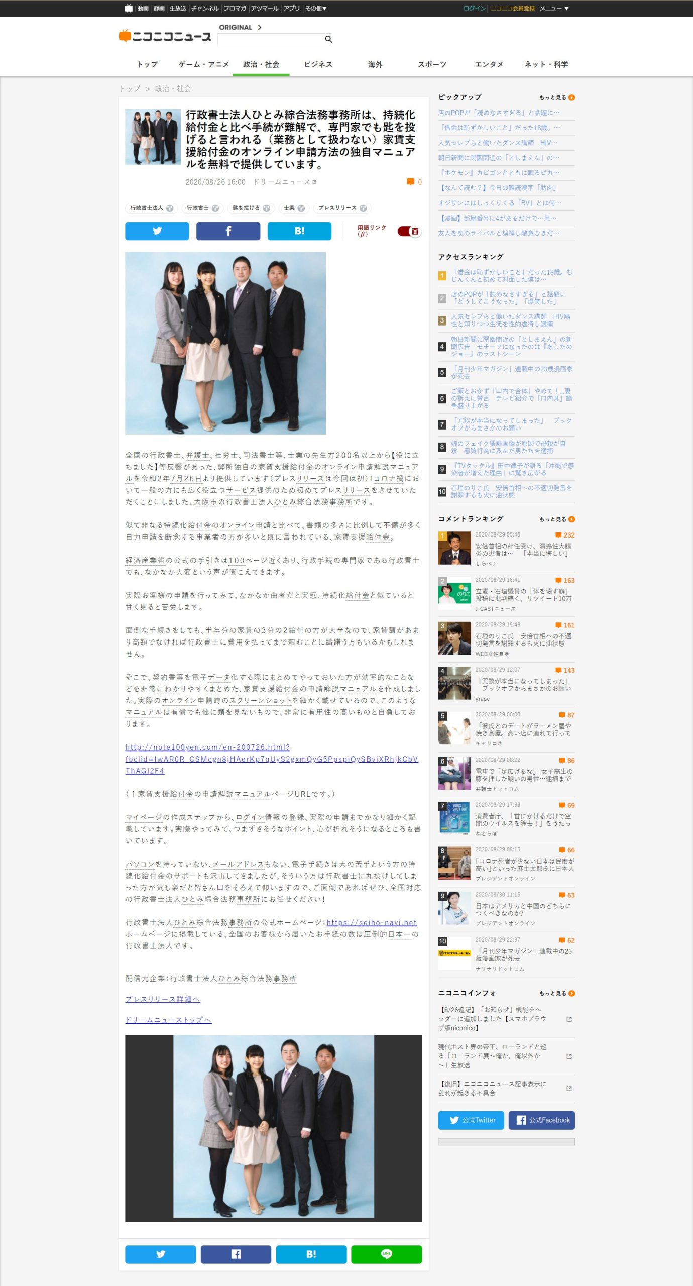 2020-08-26 / 最終更新日 : 2020-08-30 ひとみ綜合法務事務所 ニコニコニュースにプレスリリースが掲載されました 2020/8/26 株式会社ドワンゴが提供するニュースサイト、ニコニコニュースにプレスリリースが掲載されました。 →行政書士法人ひとみ綜合法務事務所は、持続化給付金と比べ手続が難解で、専門家でも匙を投げると言われる(業務として扱わない)家賃支援給付金のオンライン申請方法の独自マニュアルを無料で提供しています。 | ニコニコニュース FacebookXBlueskyHatenaCopy