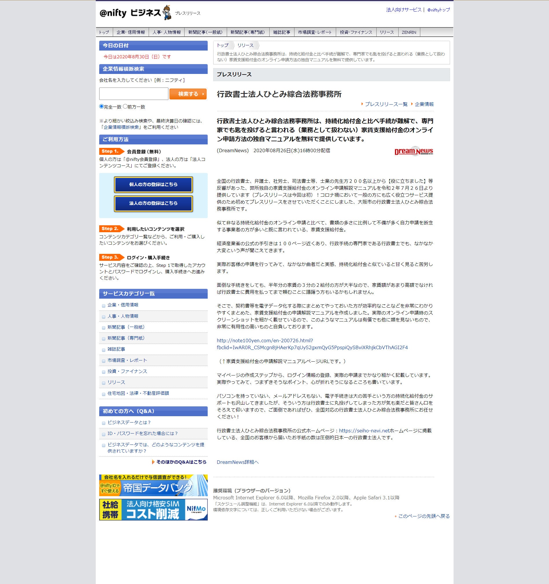 2020-08-26 / 最終更新日 : 2020-08-30 ひとみ綜合法務事務所 @niftyビジネスにプレスリリースが掲載されました 2020/8/26 @nifty社のWEBメディア:@niftyビジネスにプレスリリースが掲載されました。 →行政書士法人ひとみ綜合法務事務所は、持続化給付金と比べ手続が難解で、専門家でも匙を投げると言われる(業務として扱わない)家賃支援給付金のオンライン申請方法の独自マニュアルを無料で提供しています。 プレスリリース:@niftyビジネス FacebookXBlueskyHatenaCopy