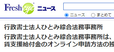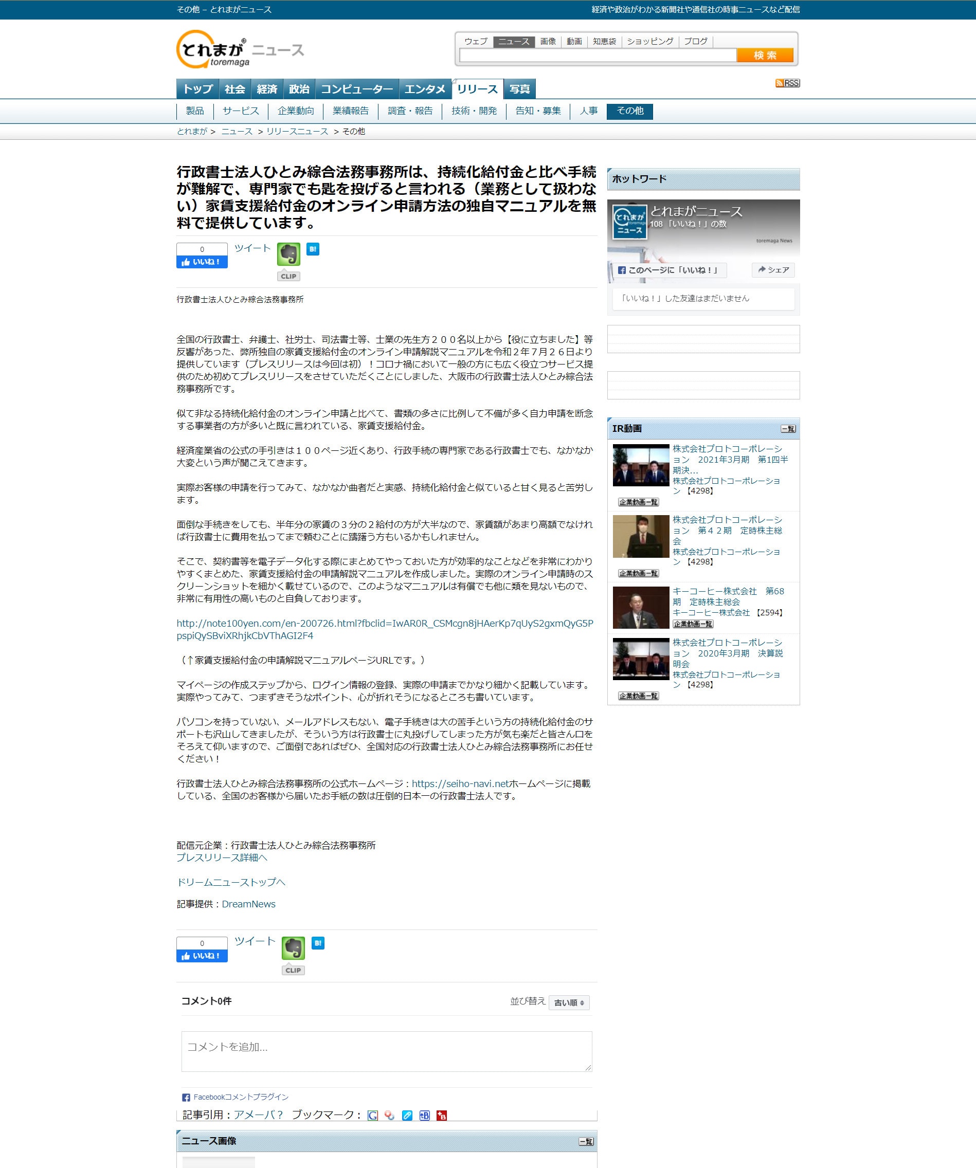 2020-08-26 / 最終更新日 : 2020-08-30 ひとみ綜合法務事務所 とれまがニュースにプレスリリースが掲載されました 2020/8/26 とれまがニュースにプレスリリースが掲載されました。 →行政書士法人ひとみ綜合法務事務所は、持続化給付金と比べ手続が難解で、専門家でも匙を投げると言われる(業務として扱わない)家賃支援給付金のオンライン申請方法の独自マニュアルを無料で提供しています。 – とれまがニュース FacebookXBlueskyHatenaCopy