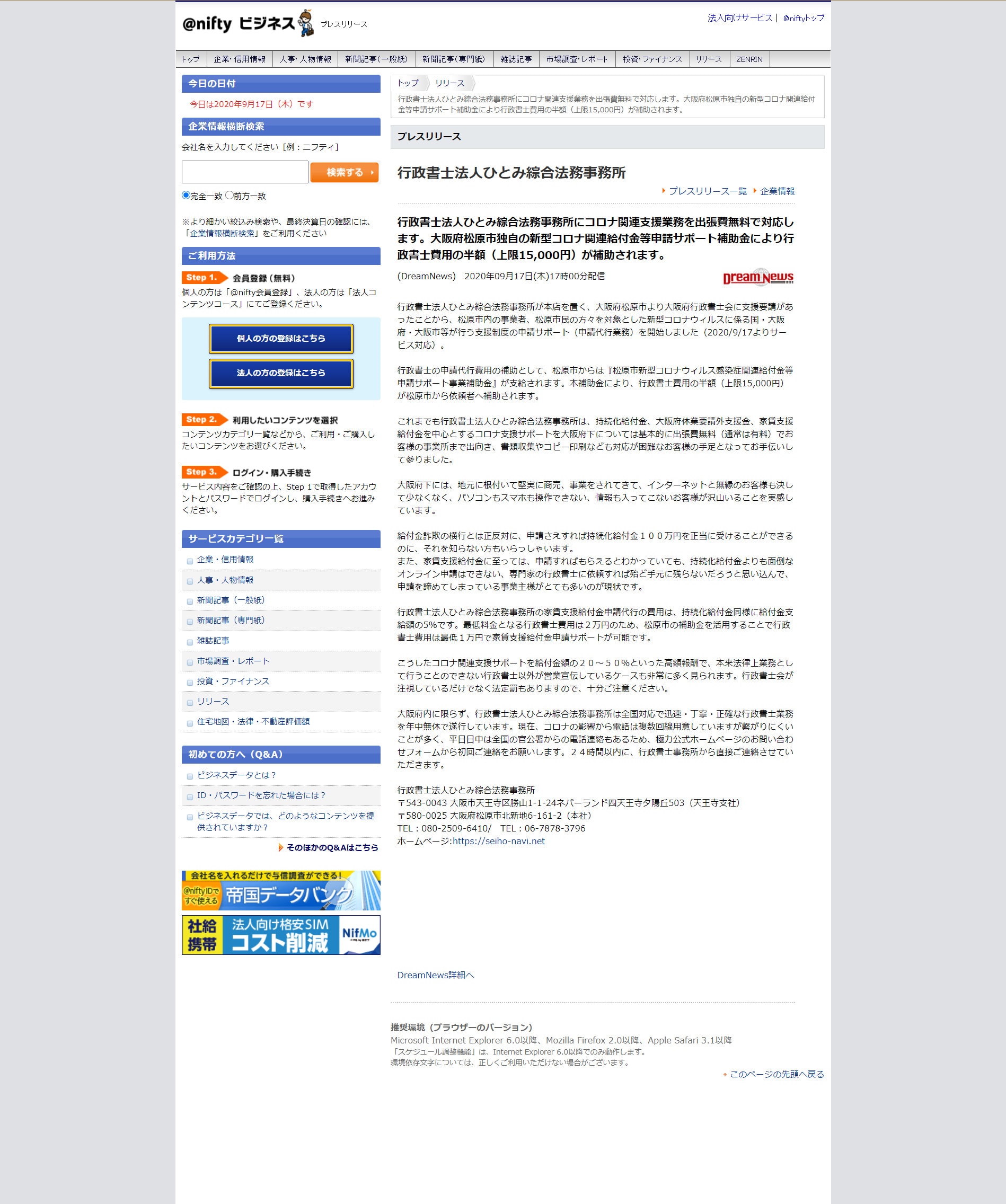 2020-09-17 / 最終更新日 : 2020-09-17 ひとみ綜合法務事務所 @niftyビジネスにプレスリリースが掲載されました 2020/9/17 @nifty社のWEBメディア:@niftyビジネスにプレスリリースが掲載されました。 →行政書士法人ひとみ綜合法務事務所にコロナ関連支援業務を出張費無料で対応します。大阪府松原市独自の新型コロナ関連給付金等申請サポート補助金により行政書士費用の半額(上限15,000円)が補助されます。 プレスリリース:@niftyビジネス FacebookXBlueskyHatenaCopy