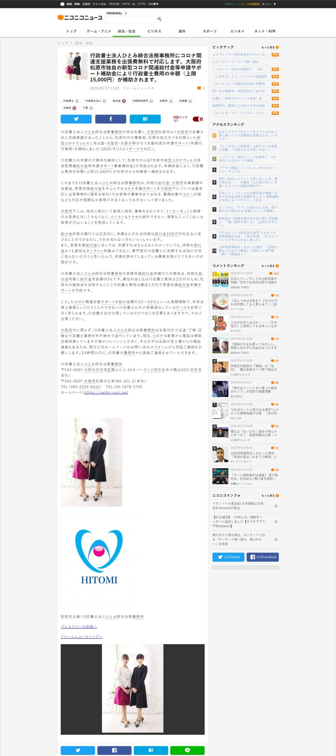 →行政書士法人ひとみ綜合法務事務所にコロナ関連支援業務を出張費無料で対応します。大阪府松原市独自の新型コロナ関連給付金等 | ニコニコニュース