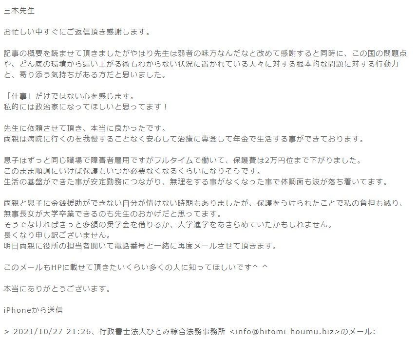 こちらのSPA!特集記事をご覧になって、行政書士法人ひとみ綜合法務事務所に寄せられたお客様からのメールです。