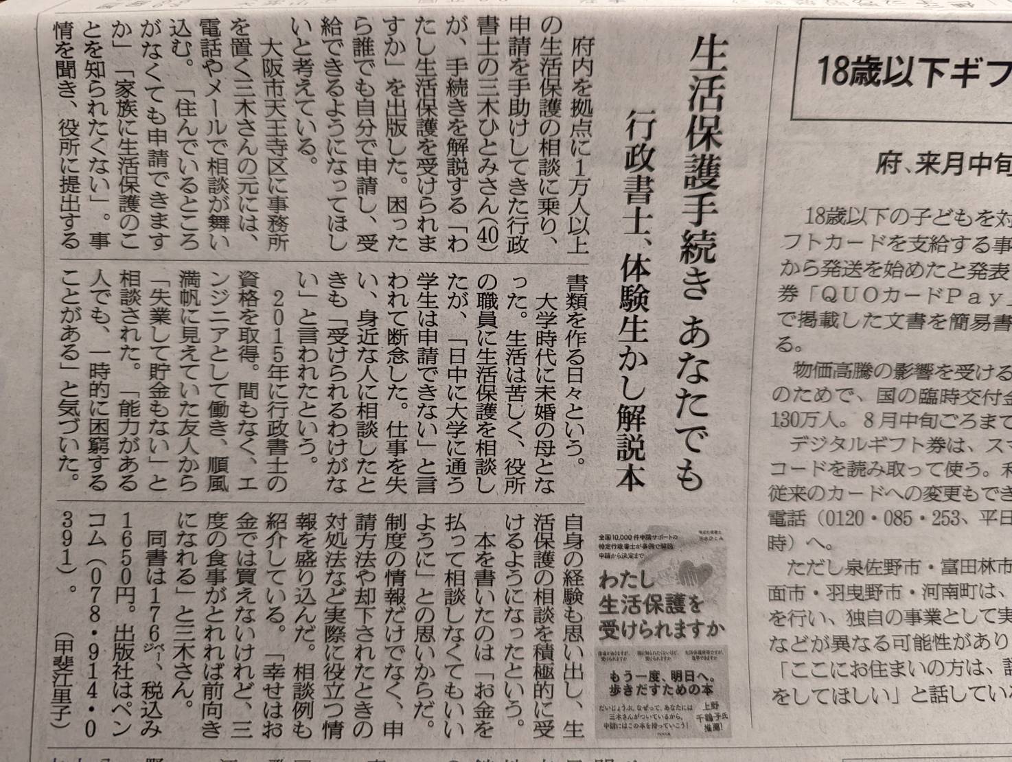 令和4年7月28日の朝日新聞朝刊に著書「わたし生活保護を受けられますか」の紹介と共に取材を受けた際の記事が掲載されました。
