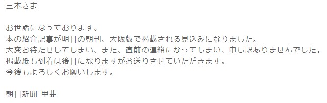新聞掲載のご連絡は前日に担当頂いた記者さんから直接メールで頂きました。東京外国語大学出身の甲斐さんにして頂いた取材は、とても楽しい時間でした。