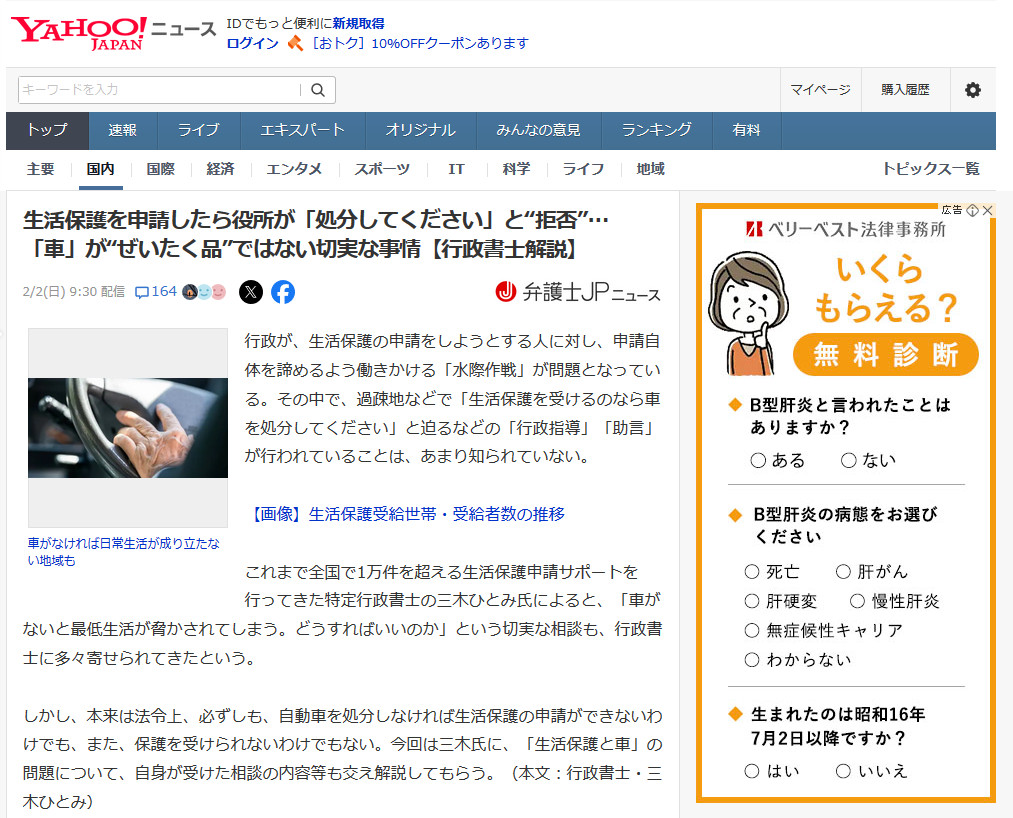 弁護士を主軸に士業、専門家が多い弁護士JPさんから、日本一の巨大ニュースサイトヤフーニュースに生活保護行政の現場の声を発信できる、又とない貴重な機会。既存の大手メディアがまだ汲み取れていない、踏み込めていない問題が沢山あります。生活困窮者、保護受給世帯の当事者の小さな声こそ、世の中に知っていただきたいものが多いのです。