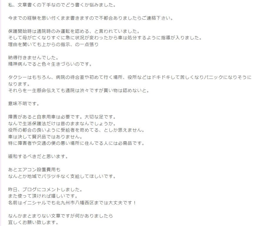 生活保護受給と車に関する記事を書いて、世にこの問題を発信したいと思った契機となった、兵庫県と福岡県の女性の生活保護受給者の方のメール文面をご紹介させてください。(それぞれに当事者の方が公開を希望された内容です。)
