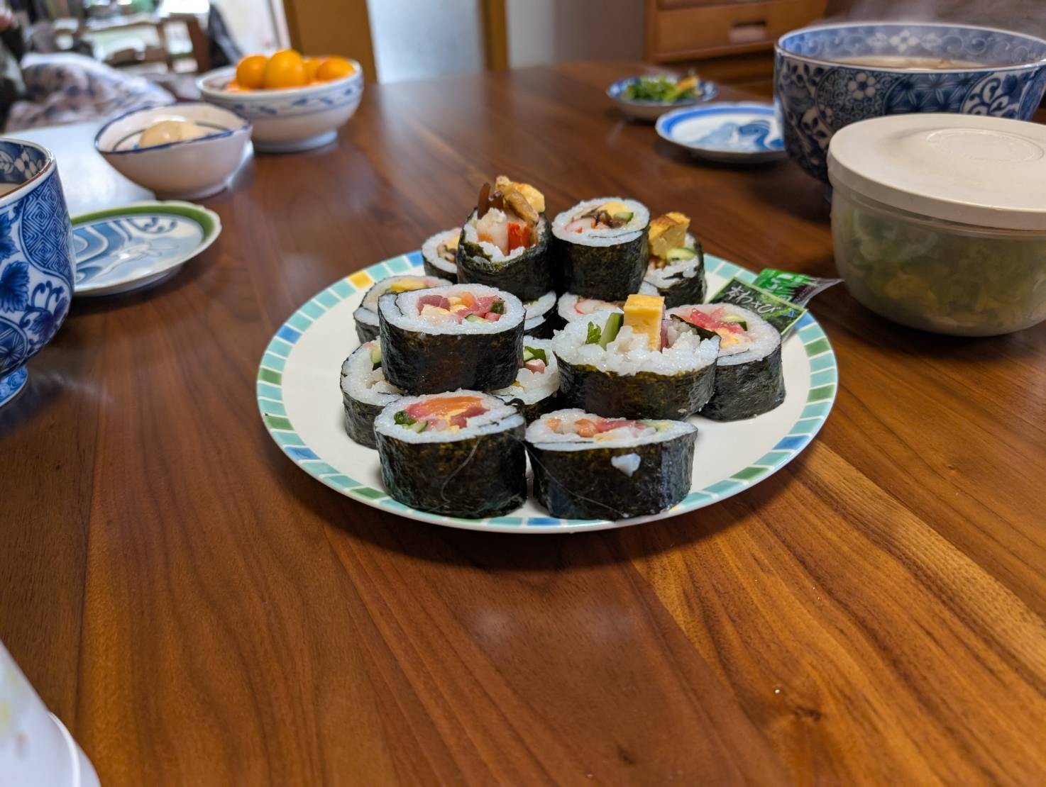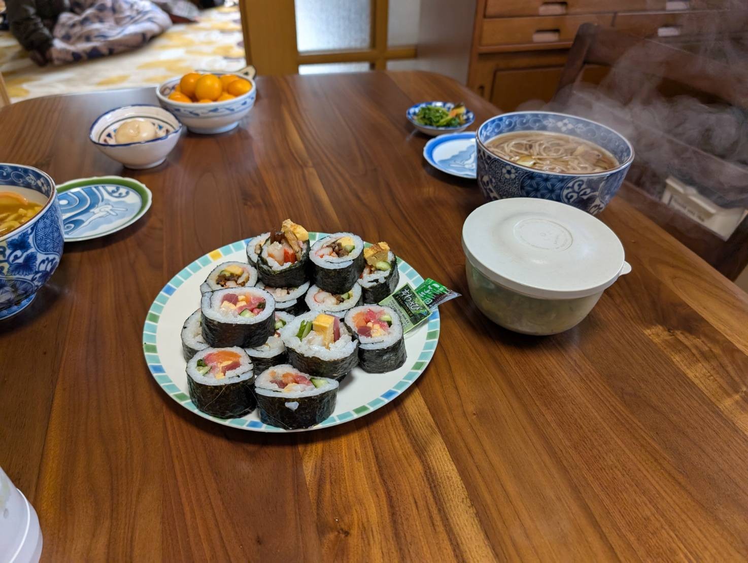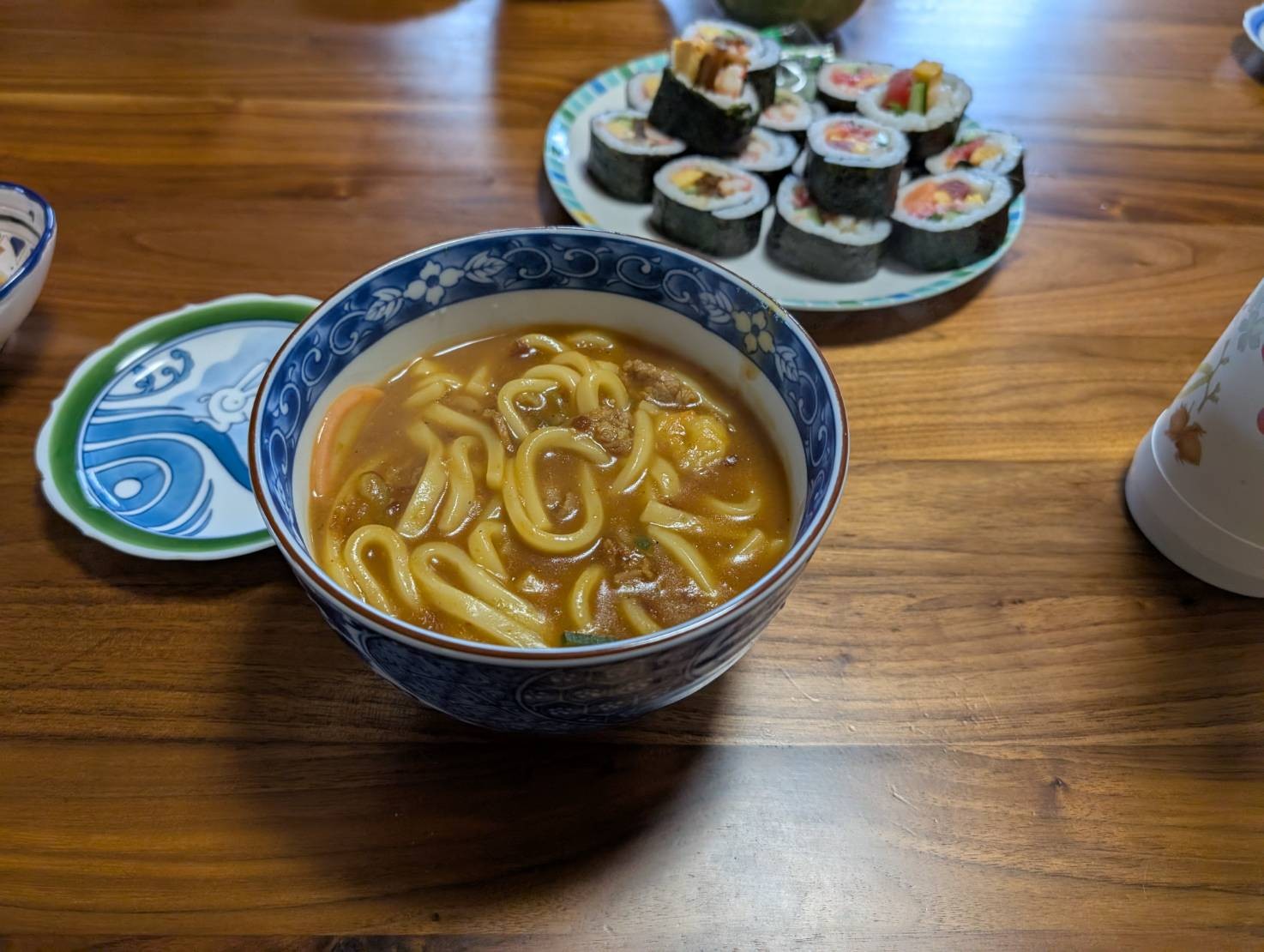 2月2日、本日の昼食はカレーうどんと恵方巻。明日は節分。