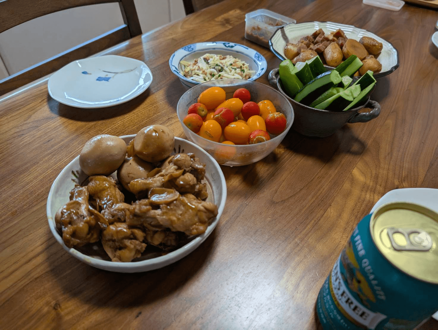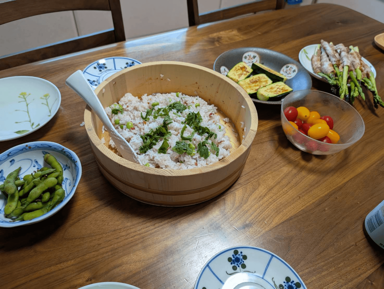 ※この日は、母、体調悪く。酢飯に材料を入れて混ぜて高校生の息子が準備してくれました。ズッキーニをフライパンで、アスパラの豚肉巻きはグリルで焼いてくれました。最近のグリルは時間設定もできるので、安心です。