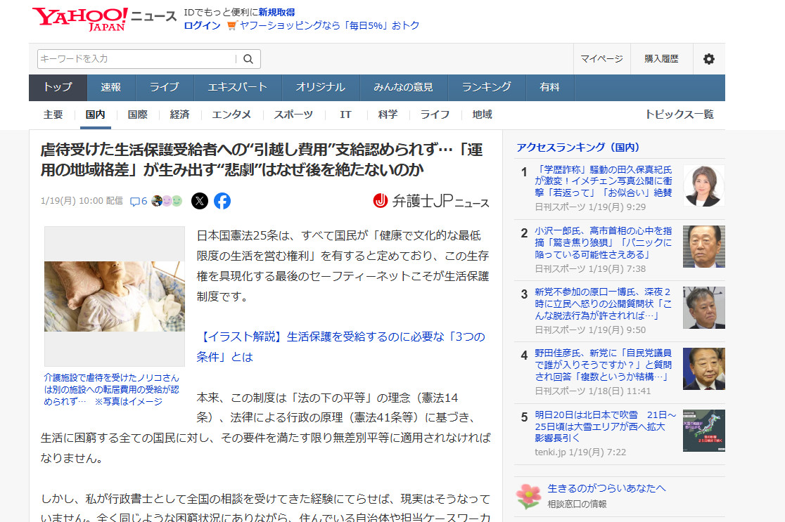 Yahoo!ニュースにて公開された「生活保護“地域格差”の実態…住む場所が違うだけで起こる“悲劇”はなぜ後を絶たないのか」この記事では、憲法が保障する「生存権」を揺るがす地域ごとの運用の違いについて、法的根拠や具体的な事例を交えて解説しています。