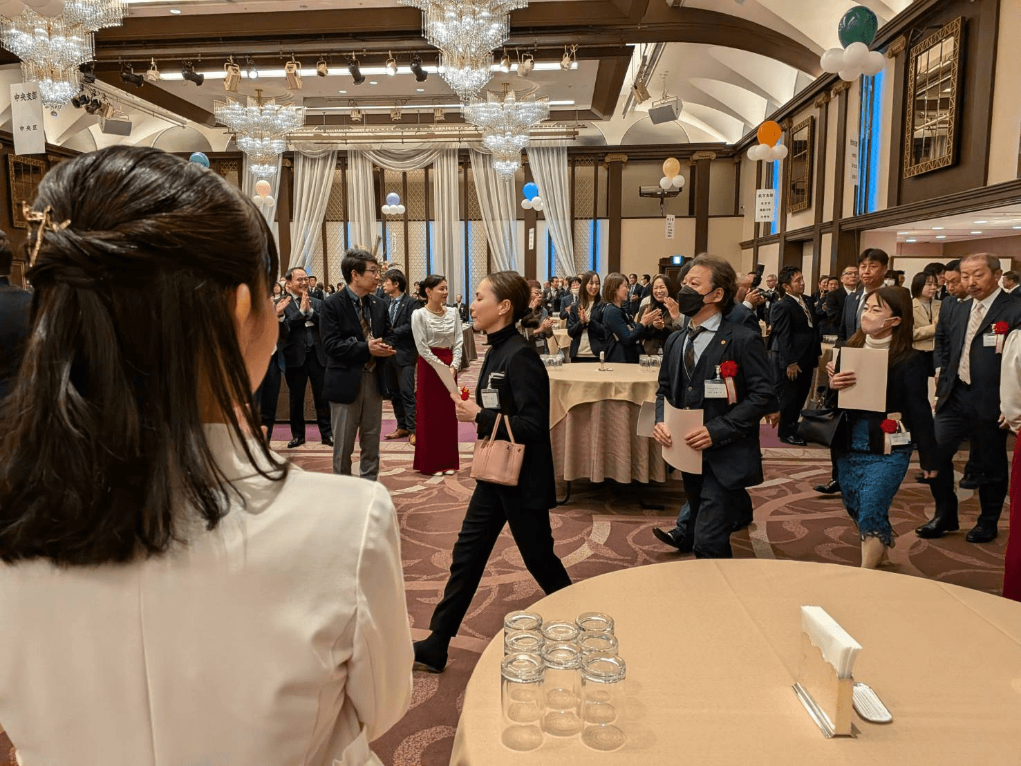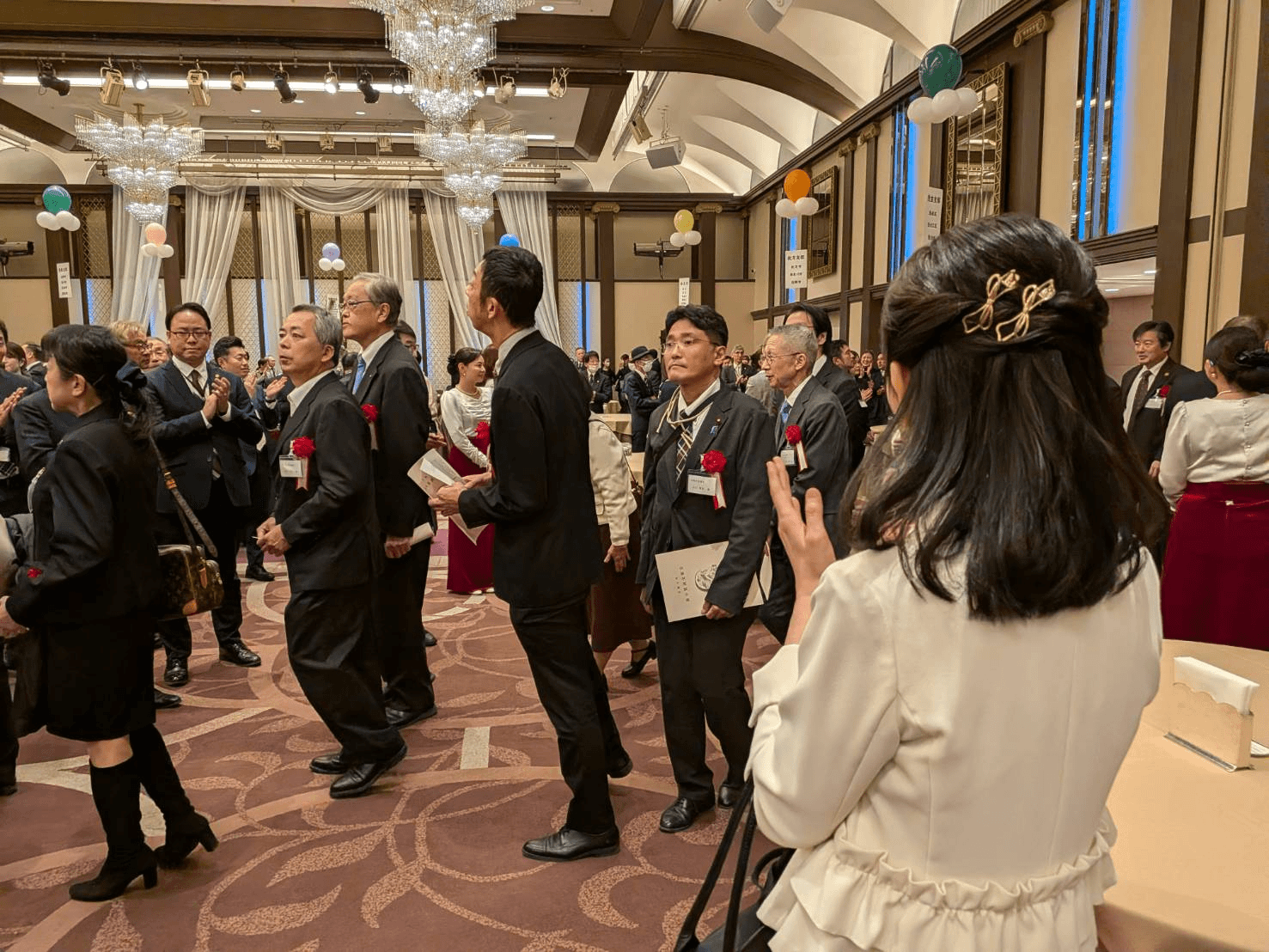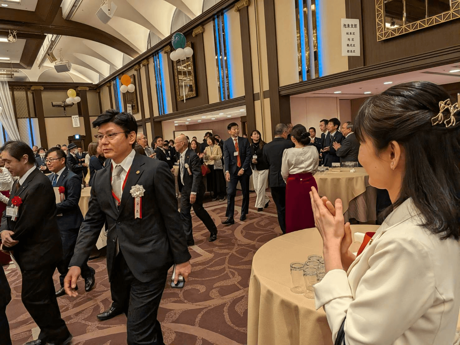 壁伝いにお立ちになって熱気の中スーツも着用で、頭が下がります。さすが会長。
