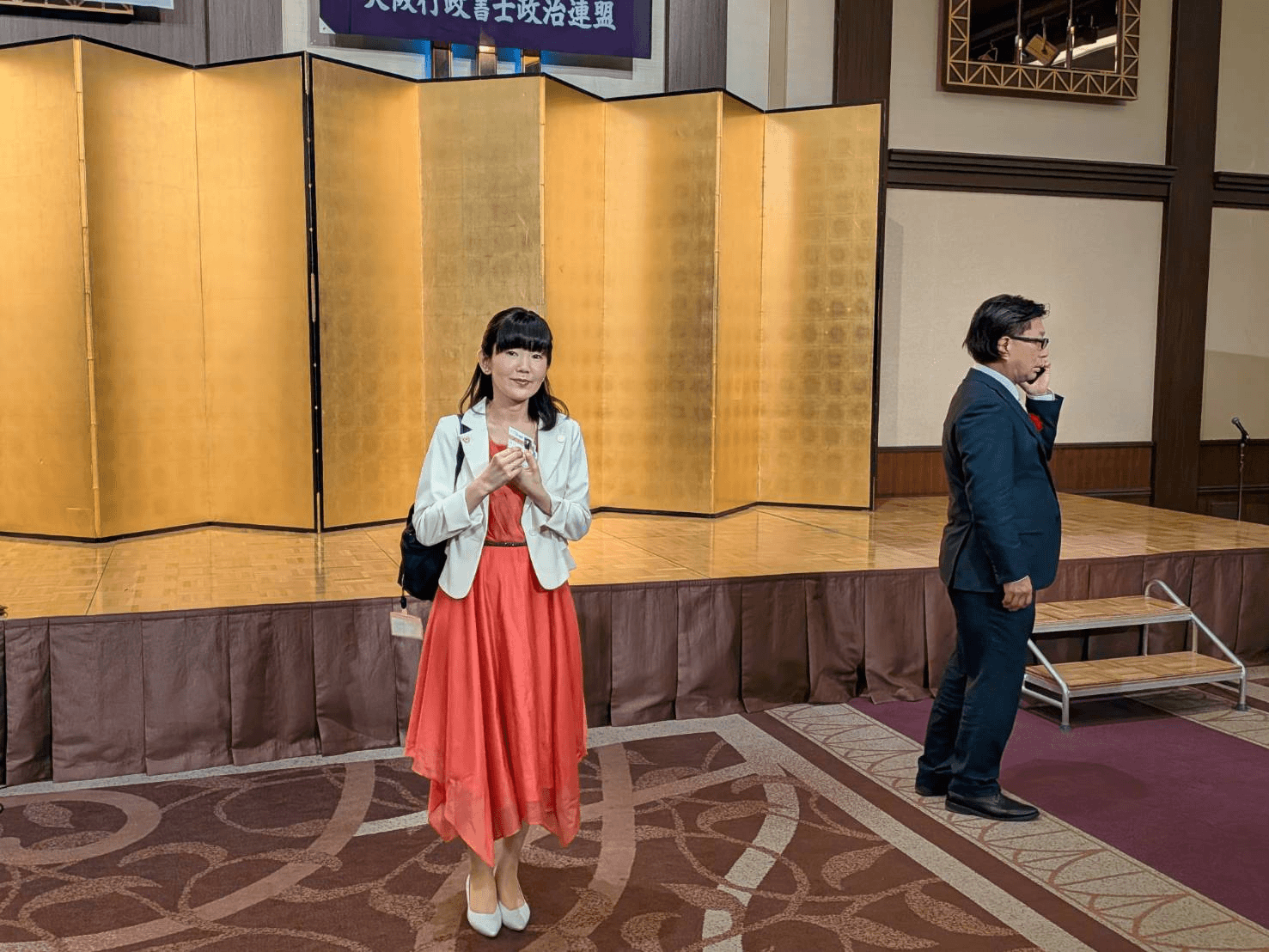日本行政書士会連合会会長の宮本先生は、会場でもずっと携帯電話でお仕事をされているご様子。お忙しそうなので、遠目に。