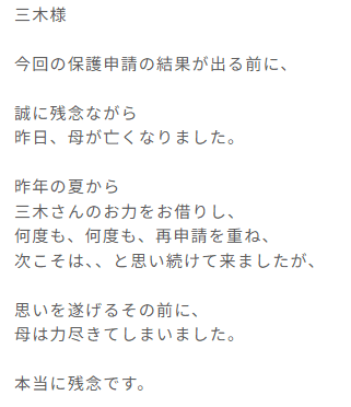 事務負担の増大は、支援の質にも直結します。神奈川県のある若いケースワーカーは、行政書士とのメールやり取りの中で本音を吐露していました。