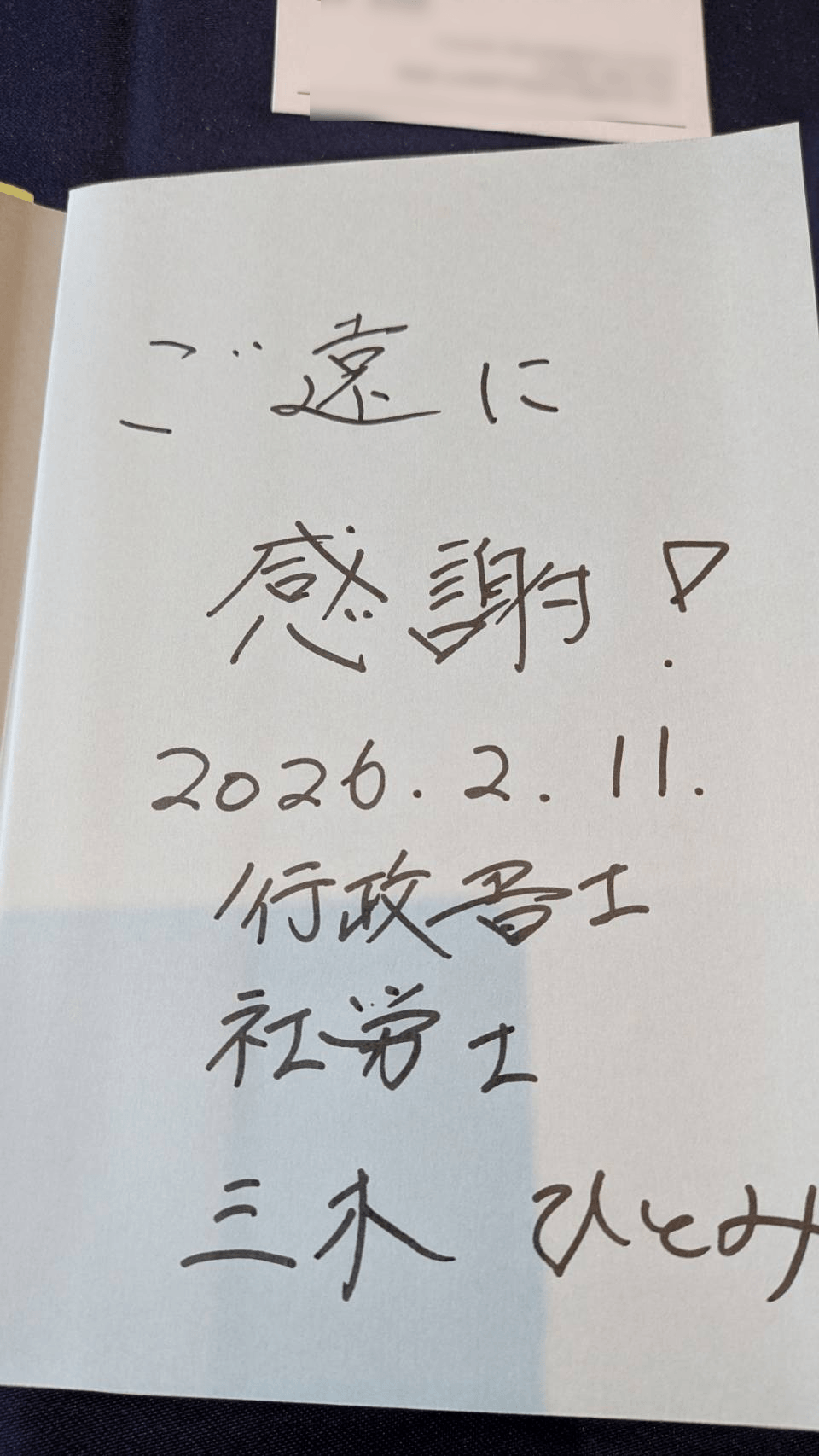 行政書士三木ひとみ著書「わたし生活保護を受けられますか」ご持参いただいた本に、サインをしてくださいと補助者の方からのリクエストに、矢間先生の詩に合わせて考えました。